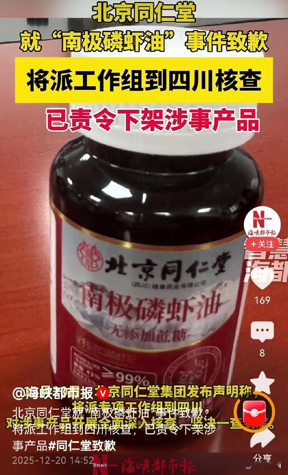 动作还挺快 20日,北京同仁堂对于“南极磷虾油”事件,进行了道歉。 前几日曝光的一款标注为“北京同仁堂99%高纯南极磷虾油”的产品,宣称磷脂含量43%,实测结果却为0,这引起了网友们的热议。 毕竟北京同仁堂也是一个响当当的老字号,如果连这个企业都失去了消费者的信任,那么,消费者到底该信谁呢? 有网友认为,出厂价仅为每瓶3元左右,而售价却高达每瓶60多元,是不是应该对购买的消费者进行退款以及补偿,毕竟这个产品吃了是一点用也没有。 也有网友认为,不能简单的道歉了事,这是涉及了虚假宣传,还是涉及了诈骗,总得有个说法。