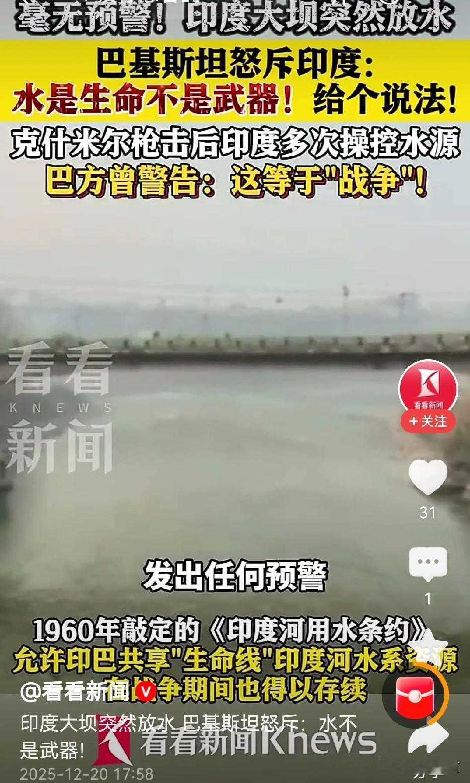没有看懂印度的操作 这是想再来一次,六比零吗? 12月19日,巴基斯坦指控印度在没有任何告知的情况下,突然开闸放水,已经严重影响到了下游巴基斯坦境内的村庄以及农田的安全。 巴基斯坦方面曾经说过,如果印度将水武器化,就视为是对巴方的攻击,巴方肯定不会坐视不管。 这很能让人联想到今年4月份的冲突,六比零看来还是没有让双方记忆深刻。 印度大坝突然放水 巴基斯坦怒了
