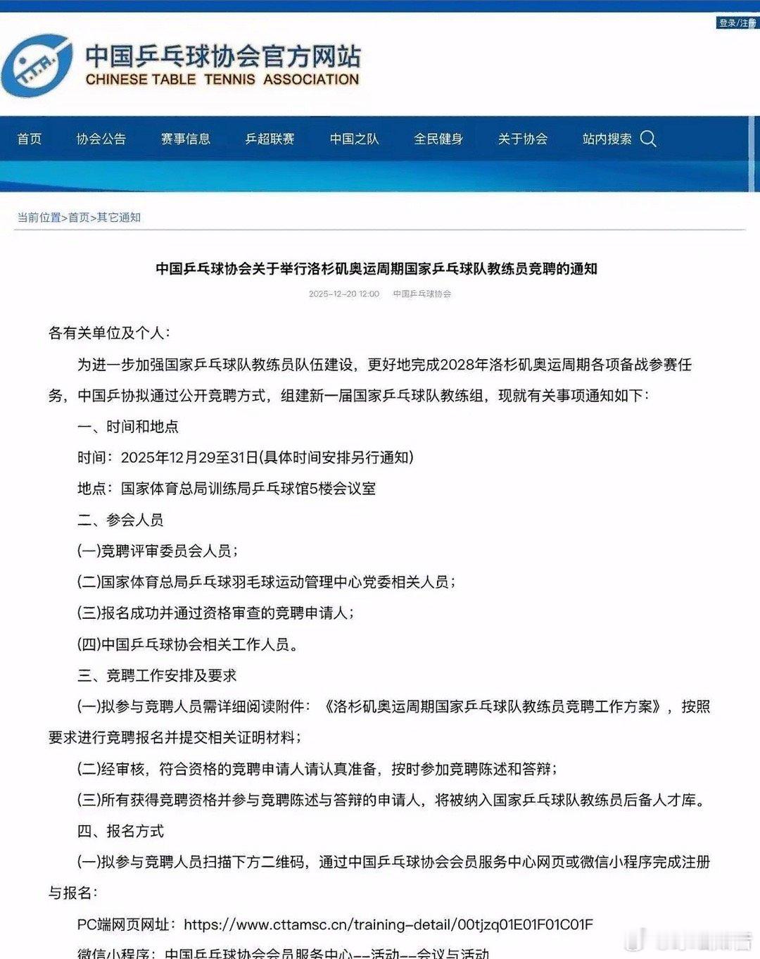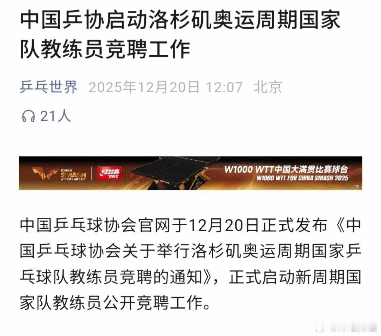 【为了那抹“中国红”,国乒教练员向新征程集结!🚩】走下领奖台,一切从零开始。面对日趋激烈的国际乒坛竞争,国乒正式启动教练员竞聘工作。每一个球、每一次挥拍的背后,都离不开教练员们的运筹帷幄与默默守护。本次竞聘不仅是人才的选择,更是精神的接力:🌟 是挑战,更是使命: 寻找具备前瞻眼光和抗压能力的带路人。🌟 是热爱,更是担当: 欢迎每一位怀揣梦想的教练员加入这个冠军集体。国球长盛不衰的秘密,在于危机感,更在于不断涌现的人才。欢迎广大球迷监督支持,让我们共同期待国乒新帅阵营的诞生!🏓️✨国乒教练员竞聘 中国乒乓 这就是国乒精神