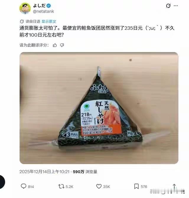 见微知著,高市上任61天,饭团涨价两倍多 12月14日一名日本网友晒出了日本饭团的价格并称“通货膨胀太可怕了,最便宜的鲑鱼饭团居然涨到了235日元,不久前才100日元左右” 而从100日元涨价到235日元就是在高市早苗上任的61天里,高市早苗上任61天日本一个简单的饭团涨价两倍多,可见日本通货膨胀的严重。 然而日本的通货膨胀本可以通过与中国的贸易解决,但是高市早苗挑衅中国后彻底断了解决通货膨胀的机会。