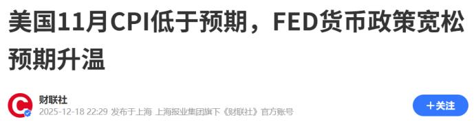 重磅利好消息!2025年12月18日,美国11月CPI低于预期,美元指数下跌,人民币汇率对应升值! 何为CPI?其全称为消费者物价指数,是一个非常重要的宏观经济指标!在度量一定的时期内,居民消费商品和服务价格水平总体变动情况的相对指数。这一指数能够直接能够反映出,居民的消费变动趋势等一些问题。 所以这一指数非常的重要,加上这一指标可以直接反映一个国家或地区的通货膨胀等情况,所以世界各国都非常的重视CPI。 就在2025年12月18日的时候,美国劳工部公布了最新的数据。数据显示美国11月份的消费价格涨幅,低于了预期。 这也就意味着美国的通胀压力进一步得到缓解,而受此影响,美联储或许会降息。这则消息对于我国来说就是一个重磅的利好消息,因为当美国的CPI低于预期的时候,能够进一步的去带动中美汇率差。 对于我国的人民币来说,这是一个非常好的消息。当美元的指数下跌后,人民币的汇率就会对应的升值。 人民币汇率升值对于我国经济来说极其重要,不知大家是否发现近年来我国的GDP持续增长,但是却始终赶不上美国。这一现象或许就受到了汇率差的影响,所以我国的GDP才会很难去赶超美国。 对此,您怎么看?欢迎评论区留言您的看法,我们一起讨论一下。 (信息来源:美国11月CPI低于预期,FED货币政策宽松预期升温-财联社)