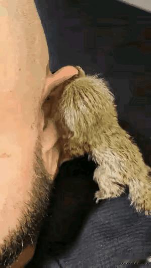 这小动物太小了,感觉比人的耳朵大不多少,看它的体型和长相,像是一只小猴子,这应该是一种特殊品种的小猴子,体型非常的小,以前还真没有见过这么小的猴子,这应该是一种非常稀有的动物,不得不佩服,老外养宠物,啥都敢养!