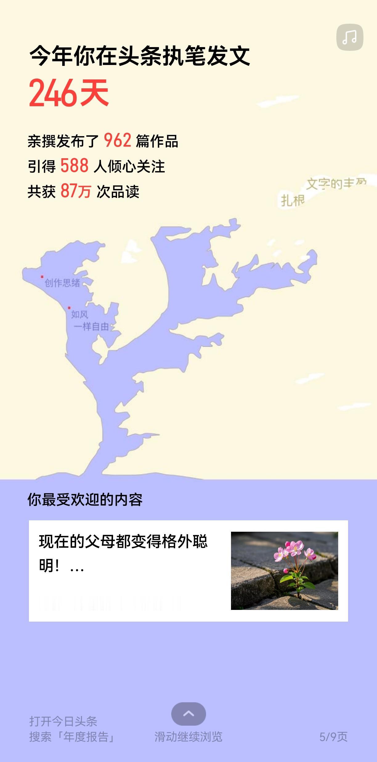 2025年的报告出来了:我的单篇文章最高阅读量超过了11万。 原来我在头条上的成绩也没有那么差。 注册头条是从2020年7月17号一共在头条上耕耘了1964天。 今年在头条上写了246天,共发表了962篇文章,获得了87万人次的点赞。 其中一篇文章的阅读量超过了11万,收到了1628个点赞263条网友的评论。 喜欢每天在头条上写作的感觉。 那种把自己的想法通过指尖变成文字,变成一篇篇文章和志同道合的条友们一起学习讨论的感觉。 真的很好。 只是不知道为什么我的微头条和文章的单价都特别的低,因此在收益上还是令人非常的失落。 说不爱钱是假的,我喜欢钱。 希望通过我的文字能够赚到一部分的生活费更是一件美妙的事情。 只是愿望是美好的现实却是很骨感的。 每次看到头条周四发工资的时候,大咖们晒出的收益都让我羡慕不已。 那只能说明自己的努力还不够大足,还需要继续摸索读者们的喜好,希望自己能够在头条上获得收益,获得认可。 2005年即将结束,期待崭新的2006年能够实现自己的愿望。 重磅上线!我的年度鉴定结果是“热爱生活记录的社交代言人”,你的结果又是什么?快来一起解锁专属年度报告!