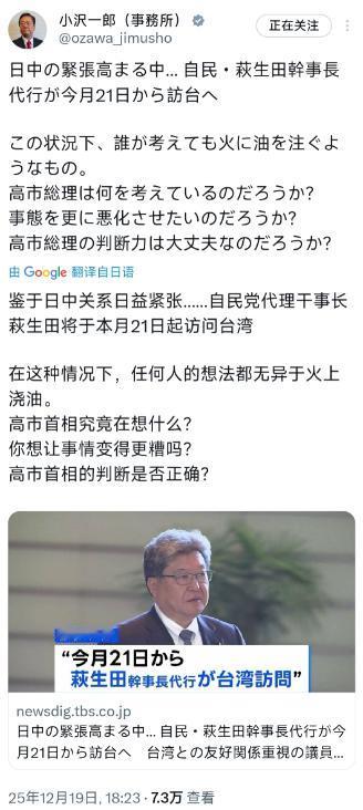 日本资深政治家小泽一郎12月19日晚发文警告:鉴于日中关系日益紧张......自民党代理干事长萩生田将于本月21日起访问台湾。 日本资深政治家、立宪民主党籍众议员小泽一郎12月19日晚在社交平台X发文警告,眼下日中关系已经日益紧张,在这种背景下,自民党代理干事长萩生田将于本月21日起访问台湾,这样的举动只会让双边关系雪上加霜。 小泽一郎的发文并非空穴来风,而是直指当前日本政坛一些激进举动对双边关系的破坏性影响,这也是他近期针对日本自民党相关激进动向的又一次公开表态。 根据台当局外事部门此前公布的信息,萩生田此次访台将率领东京都八王子市议员团同行,行程从12月21日持续到23日。此次访问并非孤立行为,而是近期日本国会议员分批窜台计划中规格较高的一批。 有消息显示,萩生田此次访台并非简单的礼节性访问,而是带着明确任务,计划与台方相关人员当面沟通。 值得注意的是,台当局外事部门负责人曾明确表示,会在接待萩生田一行期间,与日方探讨相关地区合作议题,这一安排已经突破了所谓“民间交流”的范畴,呈现出明显的官方化倾向。 小泽一郎的警告,正是看到了这种日台勾连动向对地区稳定和双边关系的负面影响。 此前小泽一郎就曾针对自民党的激进政治举动发声,批评相关行为可能让普通民众沦为牺牲品。 此次他再次发文,也是希望提醒日本政坛正视日中关系的重要性,避免因激进举动让双边关系进一步恶化。 当前日中关系本就处于紧张状态,任何涉及台湾问题的不当举动,都可能加剧地区局势的复杂程度,这也是国际社会普遍担忧的一点。 以上都是个人观点,对此您有什么不同的看法,可以在评论区留言讨论!!!