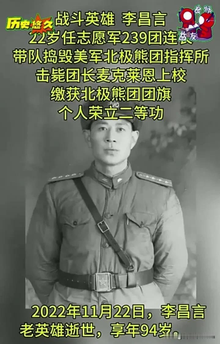 2021年,93岁山东老人看《长津湖》时痛哭流涕:“女儿你信吗?我真的是里面的伍千里,我真的缴获了‘北极熊团’团旗……” 他却从怀里掏出一张发黄的立功证书,他说自己缴过北极熊团的旗子,他叫李昌言。 女儿起初只当是老人看电影入了戏,毕竟这一辈子,父亲没跟家里人提过半个字关于战场的事——连抽屉里的旧物件,都从没露出过立功证书的边角。 直到那纸页上“二等功”的字样和部队番号清清楚楚落在眼里,她才忽然反应过来,父亲嘴里轻描淡写的“缴了面旗子”,是刻在历史里的硬仗。 那年李昌言刚满22岁,是志愿军第27军80师239团的一名连长。长津湖的冬天,寒气压得人连呼吸都发颤,美军“北极熊团”的装备堆得比雪堆还高,坦克的履带碾过冻硬的土地,枪声裹着寒风往战士们的耳朵里钻。 没人觉得端掉对方指挥所是件能成的事,可李昌言咬着牙,把棉服领口往紧裹了裹,挑了几个身手灵便的战士,借着夜色往敌人阵地摸过去。 雪地里连脚印都不敢留太深,他们趴在雪堆后面等了近一个小时,才借着美军换岗的空档钻过去。指挥所的帐篷漏着灯光,李昌言带着人猛地冲进去的时候,对方还没反应过来——他一把拽过桌上的团旗,身边的战士已经跟冲进来的卫兵扭打在一起。 等枪声停下来,帐篷里静得只剩呼吸声,他看着手里染了雪的旗子,才发现身边的通讯员胸口渗着血,攥着他袖子的手还没松开。 那面“北极熊团”的团旗,后来被送回了国内,成了纪念馆里的展品,可李昌言没跟任何人提过这是自己缴回来的。 立功证书发下来的时候,他揣在棉袄内兜里暖了好几天,后来就压在了箱底的旧衣服下面,只有夜里睡不着的时候,才偷偷拿出来,用粗糙的手指摸一摸上面的字迹。不是不想说,是一开口,就想起那些没跟着一起回来的战友,那些冻得硬邦邦的棉鞋,那些没来得及吃完的冻土豆。 这一辈子,他就像个普通的山东老人,每天拎着菜篮子去市场,坐在门口的小马扎上晒太阳,跟邻居唠的都是“今天的菜价涨了”“孙子又考了满分”,没人知道他胸口曾揣着二等功的证书,没人知道他22岁那年,在长津湖的雪地里,攥着一面团旗,看着身边的战友闭了眼。 直到《长津湖》的镜头扫过战场,直到伍千里抱着战友的画面出现在屏幕上,老人的眼泪才没忍住。 他指着屏幕跟女儿说“俺们那时候,比这还冷”,说“小王才19岁,比电影里的娃还小”,说“那旗子就是这么缴的”——不是炫耀自己的功劳,是那些压了一辈子的回忆,跟着电影里的冲锋号,一股脑涌了出来。 2022年11月22日,李昌言老英雄去世了,享年94岁。直到这时候,他的事迹才跟着那份发黄的立功证书,被更多人知道。人们这才明白,电影里的英雄不是虚构的,他们真的在雪地里趴过,真的在枪林弹雨里冲过,真的把自己的青春和战友的名字,一起藏在了平凡的日子里。 这些老兵,从来没把“英雄”两个字挂在嘴边。他们把立功证书压在箱底,把回忆埋在心里,过着跟普通人一样的生活,不是因为忘记了过去,是因为他们把战友的份,一起好好活了下来。 他们的沉默里,装着的是整个民族的底气——是有人替我们把黑暗挡在了几十年前,才让我们能坐在暖屋子里看电影,能笑着谈论今天的生活。 各位读者你们怎么看?欢迎在评论区讨论。