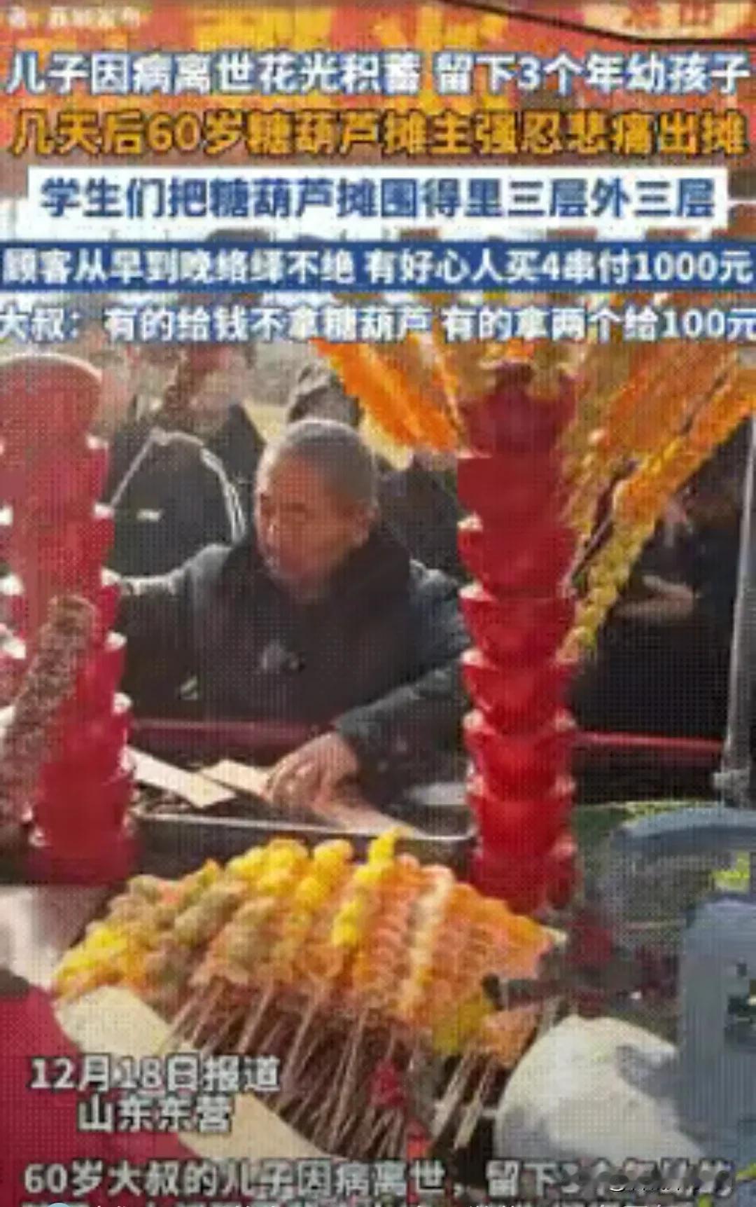 山东东营,一60岁糖葫芦摊主儿子因病离世,花光积蓄,留下3个年幼孩子,为了生活,几天后强忍悲痛继续出摊,学生们得知后,自发帮助大叔,将摊位围的里三层外三层,顾客从早到晚络绎不绝,有好心人买4串付1000元,大叔:有的给钱不拿糖葫芦,有的拿两个给100元。 大叔出摊的时候,身上外套还沾着清晨的凉气,串糖葫芦的手指偶尔会顿住——许是想起之前儿子在时,会抢着帮他把山楂串得整整齐齐。 可瞥见旁边塑料凳上孩子的小书包,他又赶紧低头搓了搓手,把散了神的目光拽回木签上。 三个娃还等着他挣回早饭钱,他不能蹲在这儿揪着丧子的疼不放,哪怕喉咙里的涩意还没消,围裙一系,他还是那个守着糖锅的摊主。 学生们是从教室闲聊里听说的事儿,没谁喊口号,下了课就你拽我、我跟你,往街角的摊子挤。原本冷清清的路边,没一会儿就排起长队。 孩子们递钱的时候不怎么说话,要么攥着皱巴巴的零钱往大叔手里塞,要么扫完码就把手机揣回兜,听见“找你钱”只摇摇头:“不用啦,这串够甜的。”有的学生明明刚吃过零食,还是攥着一串糖葫芦慢慢走,就想让后面的人能多排一会儿。 人越聚越多,路过的市民也停了脚。有人挤到摊前指了最上面四串,扫完码转身就走,大叔盯着手机上跳出来的1000元,攥着几串额外的糖葫芦追出去两步,对方却摆了摆手:“给娃留着吃。” 还有人更直接,递过一张百元钞没碰摊子,只说“给孩子买文具”,不等大叔开口推辞,脚步已经融进了人群里。 大叔攥着那些钱的手有点发僵,他不是没推过,可每回刚张开嘴,对方要么笑着转开话题,要么干脆快步走开。他懂这些人的心思——不是要施舍,是想让他能顺理成章地接着这份帮衬。 他说不出太多谢字,只能把每串糖葫芦裹糖裹得更匀实,递出去时专挑最红最圆的那串塞过去。 这摊前的热闹和别处不一样,没人举着手机刻意拍,没人扯着嗓子喊“快来帮忙”,就是你排完队我接上,递钱、拿串、转身,安安静静的,却裹着一股子暖。 这种暖是普通人对普通人的体谅:知道他的痛替不了,知道他养娃的难扛不住,只能用最不扎眼的方式,帮他把日子撑下去。 网友说“这才是网络该有的视频”,不是这视频拍得多精致,是这事儿撞在了人心最软的地方。 现在太多刻意的炒作、夸张的剧本,唯独这种没修饰的善意最能让人红眼眶。它不是什么惊天善举,就是学生省下的零花钱、市民多付的那笔钱,是不想让他难堪的、悄悄递过去的温暖。 这些细碎的、没声张的好,拼起来就是生活里的光。人这一辈子谁都有站不稳的时候,能有人伸手不是拉着你喊“你好可怜”,是陪着你站一会儿,让你知道自己不是一个人扛着。这才是日子该有的样子,是普通人之间,最踏实的托举。 各位读者你们怎么看?欢迎在评论区讨论。