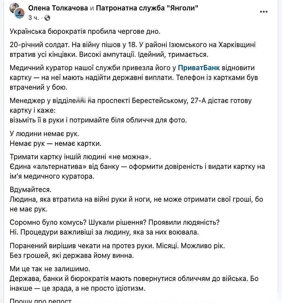 “你想想办法,拿起银行卡,拍个照。” 说这话的,是银行的职员。 听这话的,是一个在战场上,手脚都没了的英雄。 我看到这条新闻的时候,真的气到发抖。 一个为国捐躯、只剩下躯干的军人,去银行想把卡解冻。结果被一个冰冷的“规定”拦在外面。 护理员想帮忙,不行,规定说了,必须本人持卡。 本人?他拿什么持?用牙咬吗? 我有时候真的不懂,是我们的世界疯了,还是制定规则的人脑子里少了根弦。 他为国家献出了四肢,银行却要他献出最后的尊严。 这是人话吗?这是人干的事吗? 后来银行道歉了,说会改进。 呵呵。 每次都是这样,捅出天大的篓子,舆论炸了,然后轻飘飘一句“我们深感抱歉”。 有些伤害,不是一句对不起就能抹平的。 有些愚蠢,不是一个“改进”的承诺就能掩盖的。 说白了,这根本不是什么规定不合理的问题,这是人心的问题。 是那个职员,是那个银行的系统里,已经没有“人”了,只剩下了流程、KPI和冷冰冰的条款。 有时候,最大的敌人不是炮火,而是我们自己人那颗被“规定”喂大的、冷冰冰的心。