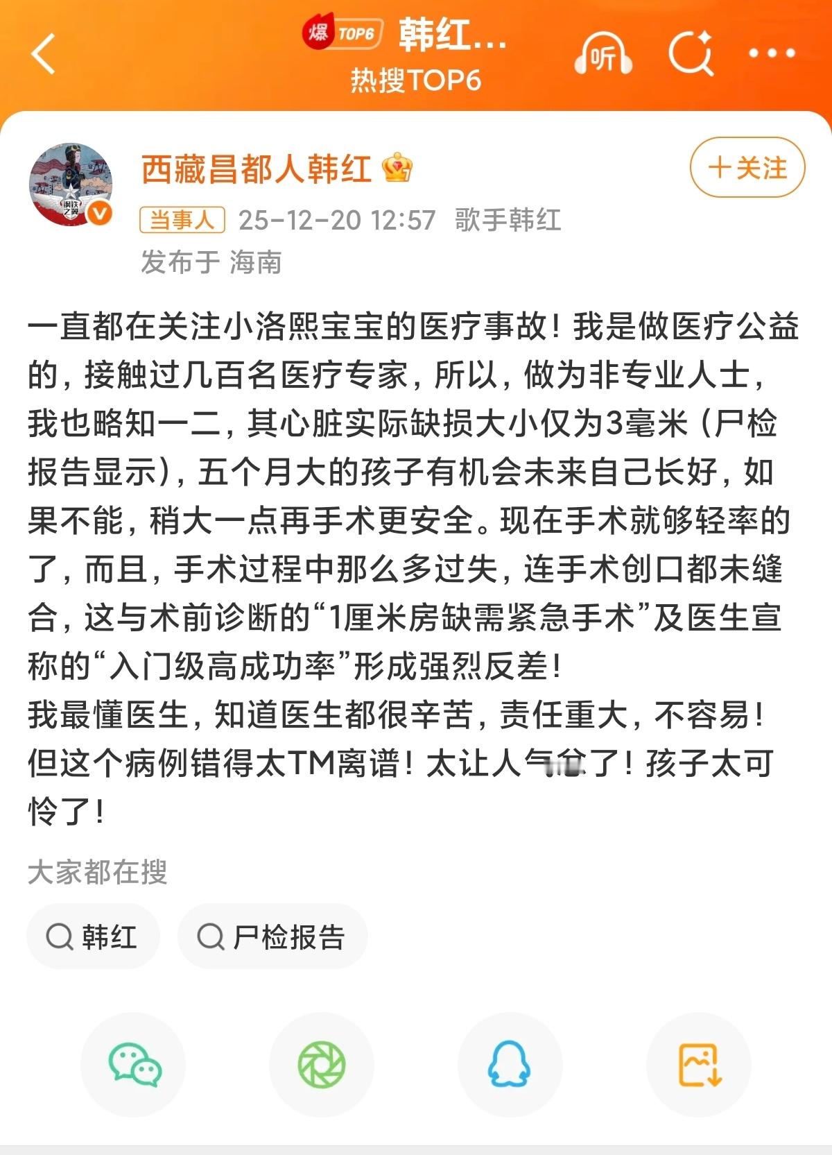 韩红为小洛熙宝宝发声必须为韩红老师点赞!她真的太敢说了,作为医疗公益从业者站出来为小洛熙发声,把这起医疗事故里的离谱过失全摆到台面上,这才是真正有社会责任感的公众人物啊!韩红为小洛熙宝宝发声 想想五个月大的宝宝,就因为医院术前误诊、术中操作重大失误没了,3毫米的房缺被说成1厘米要紧急手术,肛肠科转心外科才一年的医生主刀,还出现创口不缝合、体外循环超时三倍的低级错误,这根本就是拿生命当儿戏!韩红指出的手术决策轻率、操作过失、医疗信任崩塌这三大问题,每一个都戳中了要害。要是没有韩红老师发声,这事儿说不定就被压下去了,现在全网关注才让更多人看到医疗体系里的漏洞,也让家属的诉求能被听见。支持韩红!更支持彻查到底,让涉事方付出应有的代价,给小洛熙和家属一个公道!