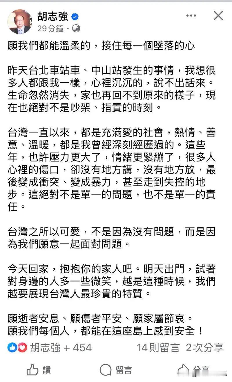 可拉倒吧! 胡志强:现在绝对不是吵架、指责的时刻,台湾一直以来都是充满爱的社会。 2025年12月20日,针对近期发生的北捷连续攻击事件,造成了重大伤亡,前台中市长胡志强在社交媒体上发声,强调“现在绝对不是吵架、指责的时刻”。他指出,台湾的美好并不在于没有问题,而在于大家愿意共同面对挑战。 胡志强表示,台湾一直以来都是一个充满爱的社会,温暖和善意是这个社会的基石。然而,近年来,随着压力增加和情绪紧绷,许多人内心的痛苦没有得到倾诉的渠道,最终导致冲突升级。他坦言,这次事件绝不是单一问题或责任所致,是社会更深层次问题的反映。 他用沉重的语气表达了对事件的感受,称许多人和他一样,心中充满了悲伤和无奈,因为生命的突然消逝使得家庭无法再回到从前。他再次强调,在这样的时刻,大家更应该团结一致,而不是互相指责。 在呼吁人们关注身边的人时,胡志强建议大家回家后多抱抱家人,明天出门时尝试对周围的人多一些微笑。他认为,越是在这种艰难时刻,展现台湾人最珍贵的特质显得尤为重要。 最后,他向遇难者致以哀悼,祝愿伤者早日康复,并希望每个人都能在这座岛上感受到安全,能够温柔地接纳每一个受伤的心灵。 就你们现在对年轻人的教育和倒行逆施的政策,出现这个情况,也算是求仁得仁了,就别再说台湾最美的是人了。