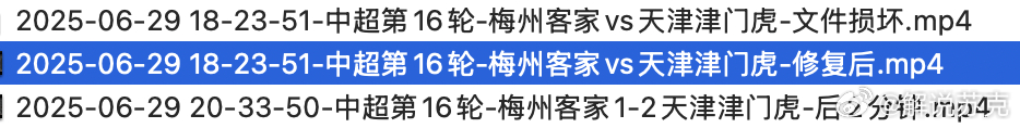 当初直播梅州那场停电了……然后录屏的文件就损坏了。然后虽然生成了一个文件,但是打不开。就想了各种办法,最后找了个修复软件,花了98……修复完了……发现并不能用……不过还有个声音,也算够用了。各位早休息哈,白天更新一个今年解说津门虎的进球集锦。