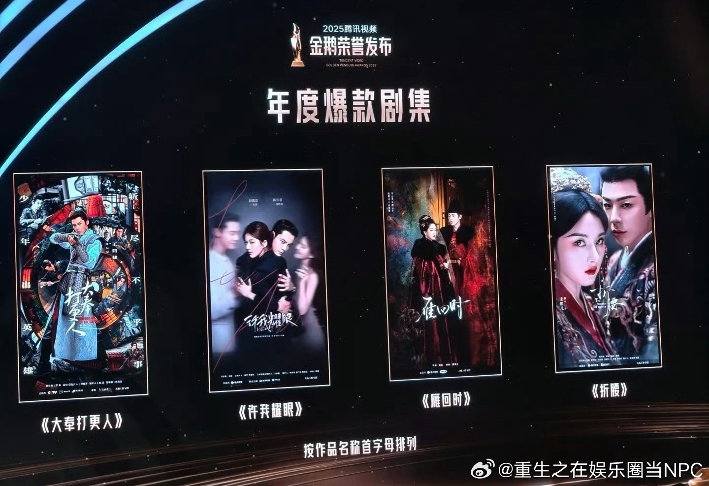 腾讯视频的金鹅奖发布腾讯年度爆剧王鹤棣、田曦薇《大奉打更人》赵露思、陈伟霆《许我耀眼》陈都灵、辛云来《雁回时》宋祖儿、刘宇宁《折腰》 在今年的剧里来说比较实至名归