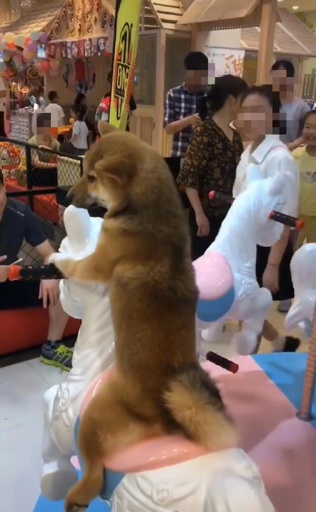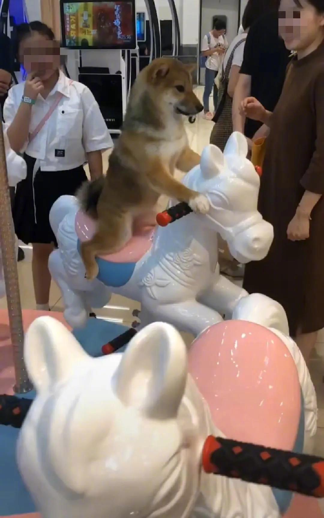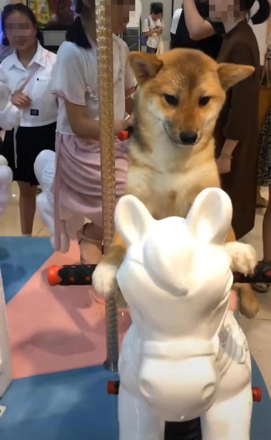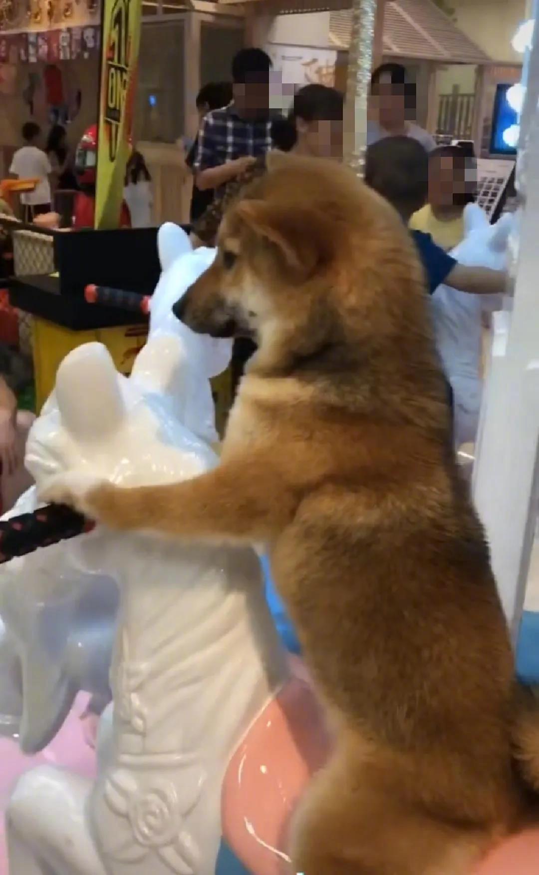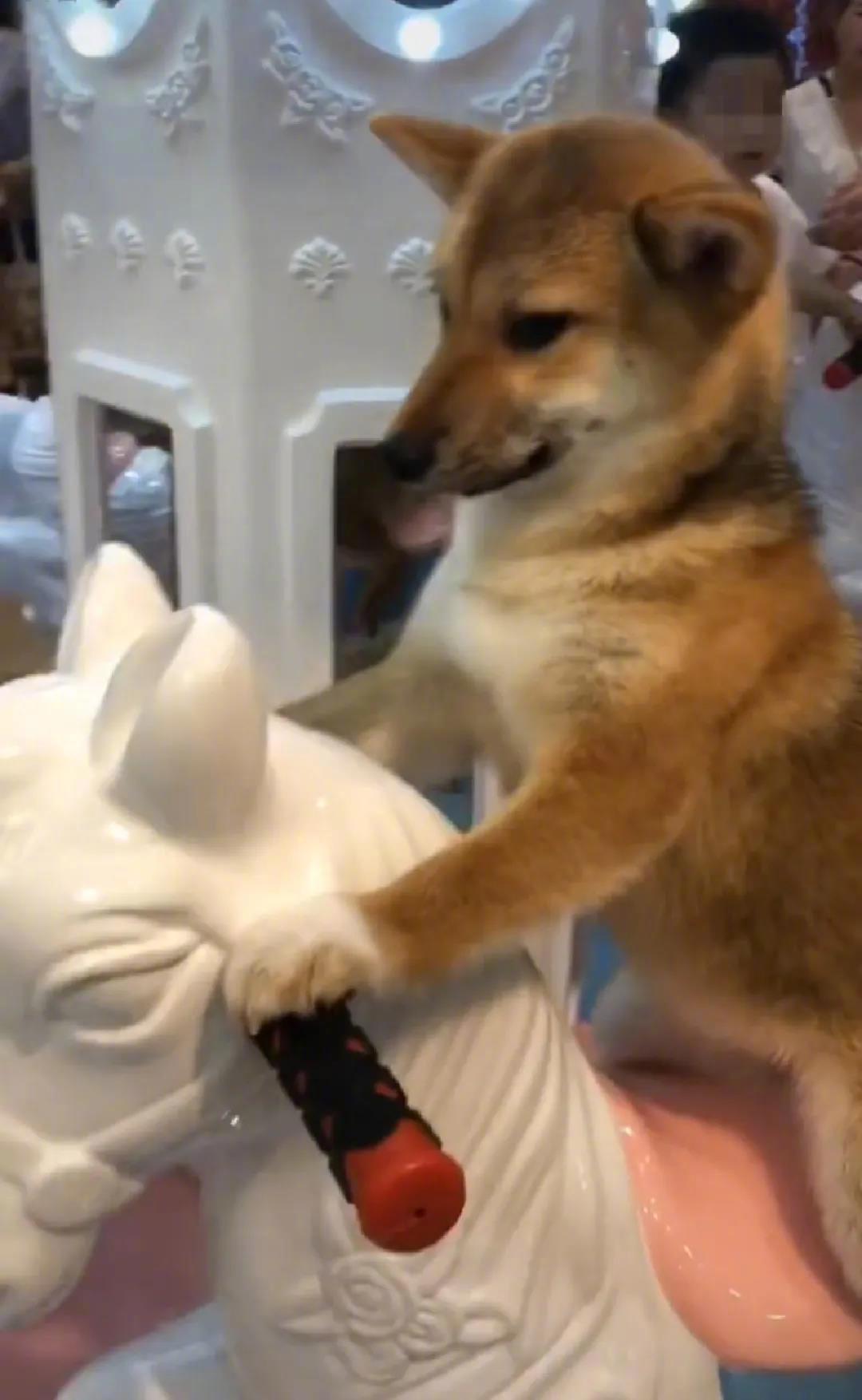 原来毛孩子也钟意坐旋转木马,转几圈了还不愿下来,好在女主人是有钱人,说等它坐累了才下来吧。