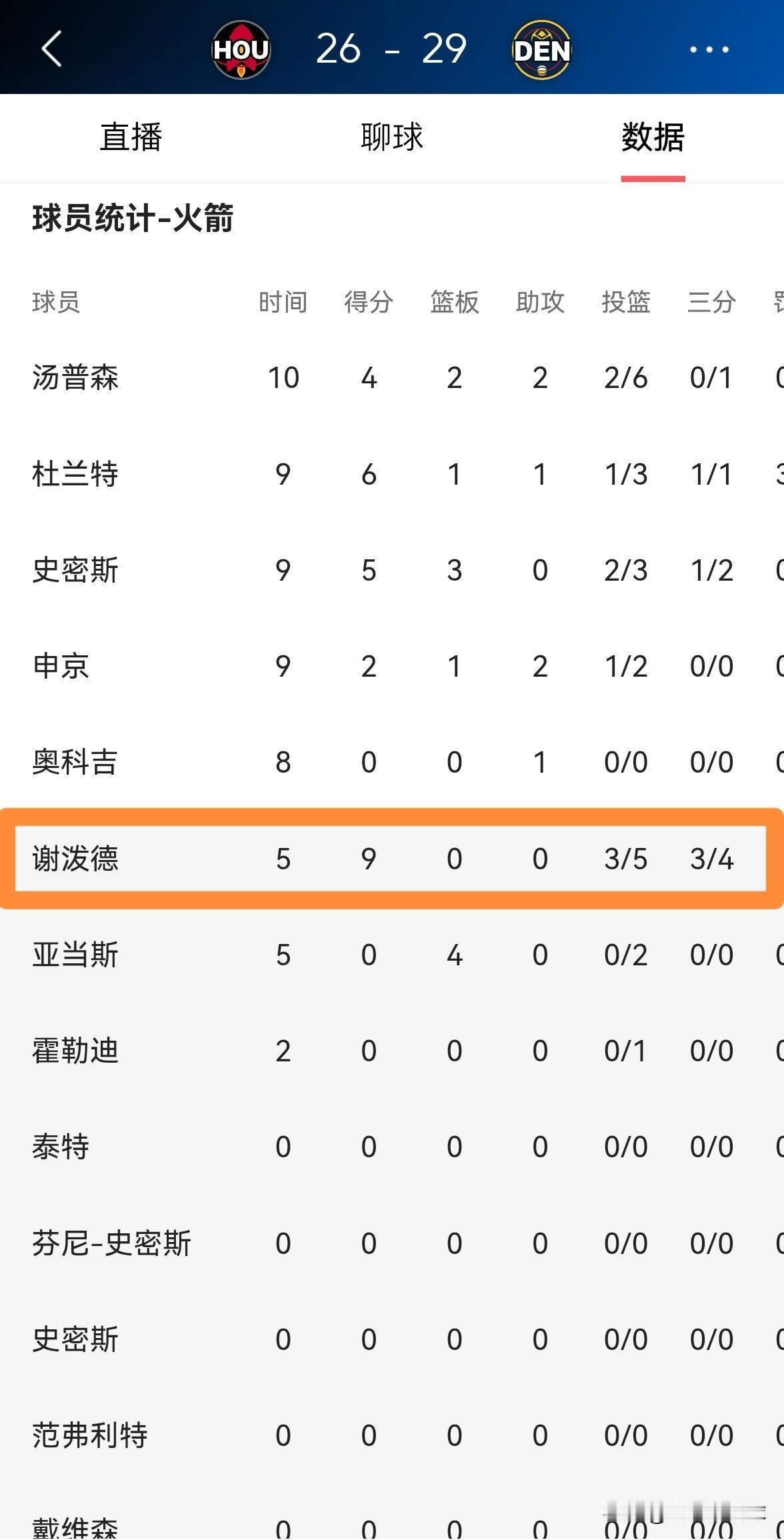 火箭超级新星谢波德真是太出人意外了!在今天火箭客场挑战掘金的焦点战中,目前双方的首节比赛已经结束,虽然火箭暂时以26:29落后于对手,但是谢波德却成为了火箭表现最好的球员。 在第一节比赛中,谢波德替补出战5分钟,三分球4中3非常高效的砍下9分,没有出现任何的失误。 谁能想到在杜兰特被对手限制住的情况下,谢波德竟然承担起了得分重任?谢波德的表现真是让人既意外又惊喜。