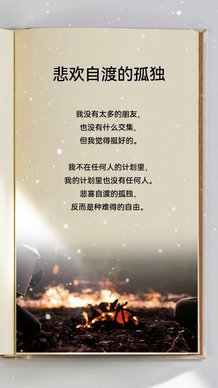 悲欢自渡的孤独。 我没有太多的朋友,也没有什么交集,但我觉得挺好的。我不在任何人的计划里,我的计划里也没有任何人。悲喜自渡的孤独,反而是种难得的自由。