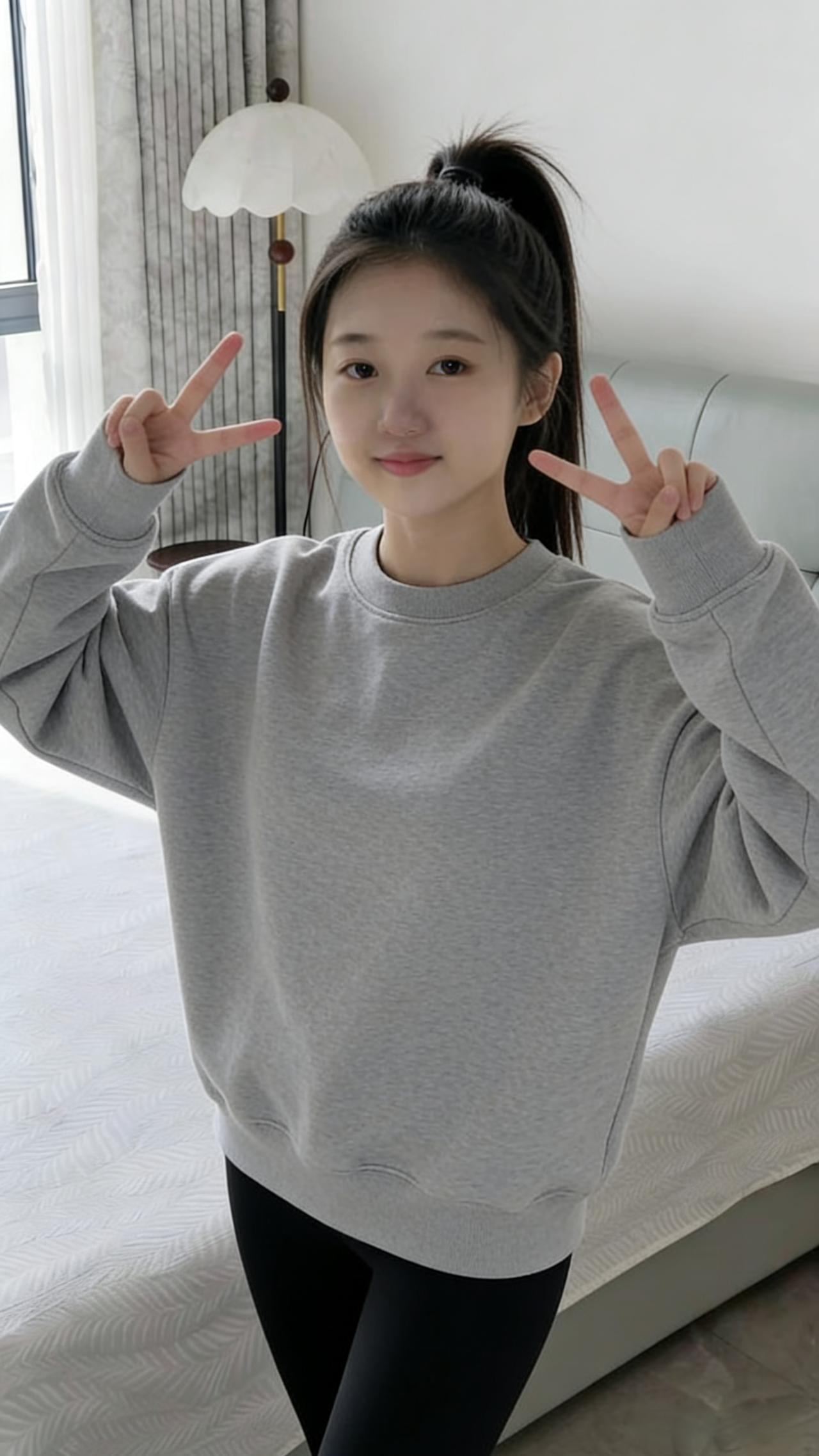 晨光漫过窗棂的纹路 揉碎在她束起的马尾上 像春日里跑跳的风 卷着未散的甜软 ~ 灰色卫衣松垮地裹着肩头 是云朵落在人间的模样 她比出的剪刀手 剪开了晨雾的薄纱 ~ 指尖翘起的弧度 是年少独有的轻快 睫毛垂落时 藏住星子般的眸光 ~ 身后的灯盏凝视着这一切 衬得房间温软如棉 青春就是这样的啊 在平凡的日子,开出温柔的花