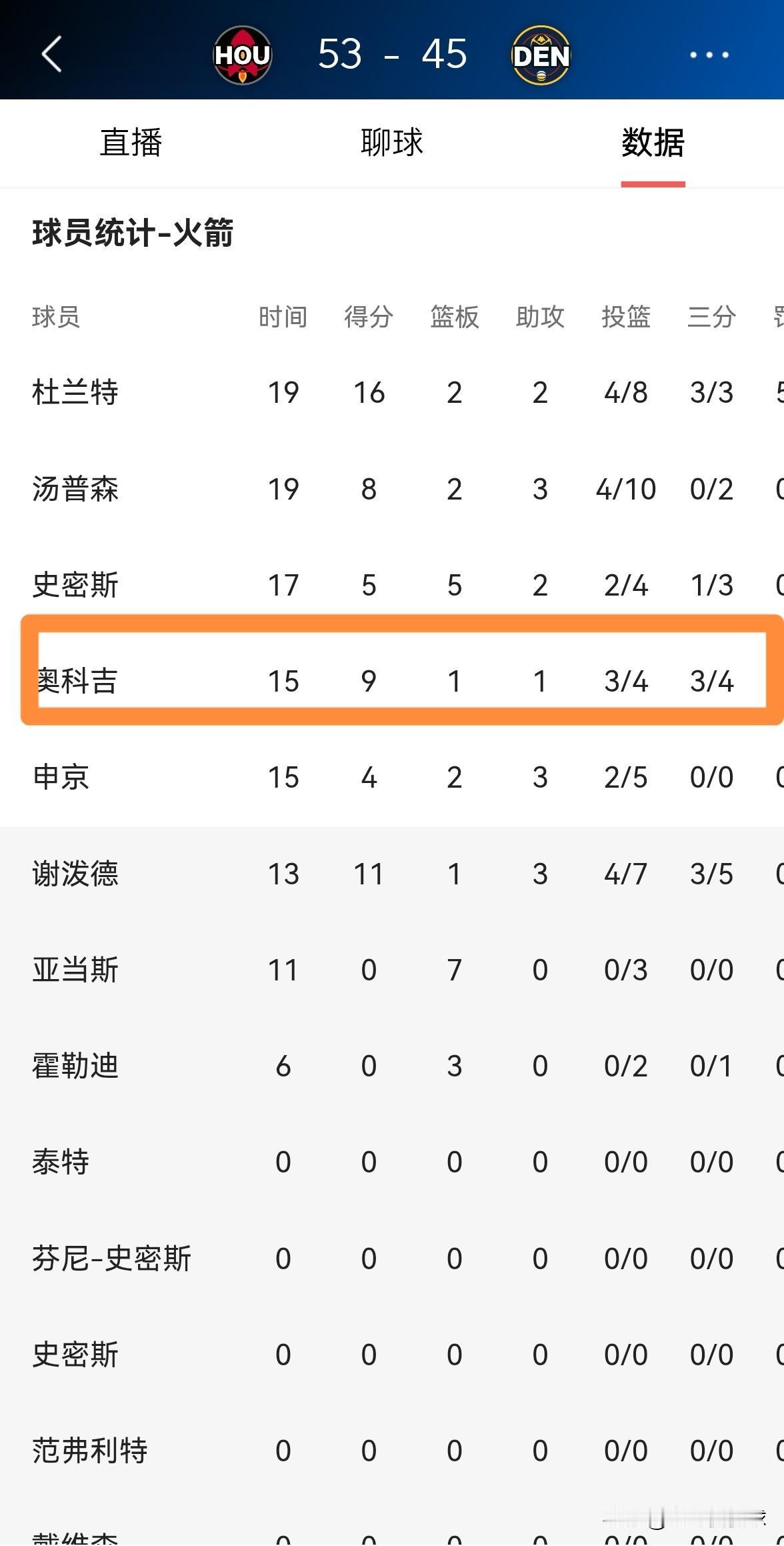 火箭大将奥科吉又爆发了!在今天进行的火箭和掘金的上半场比赛中,奥科吉首发出战15分钟,三分球4中3非常高效的砍下9分,还有1篮板1助攻,他的场上正负值为+9。 作为一名角色球员,奥科吉能够在15分钟的上场时间里打出如此精彩的表现真是太匪夷所思了,这需要奥科吉把握住每一次的三分空位投篮机会。