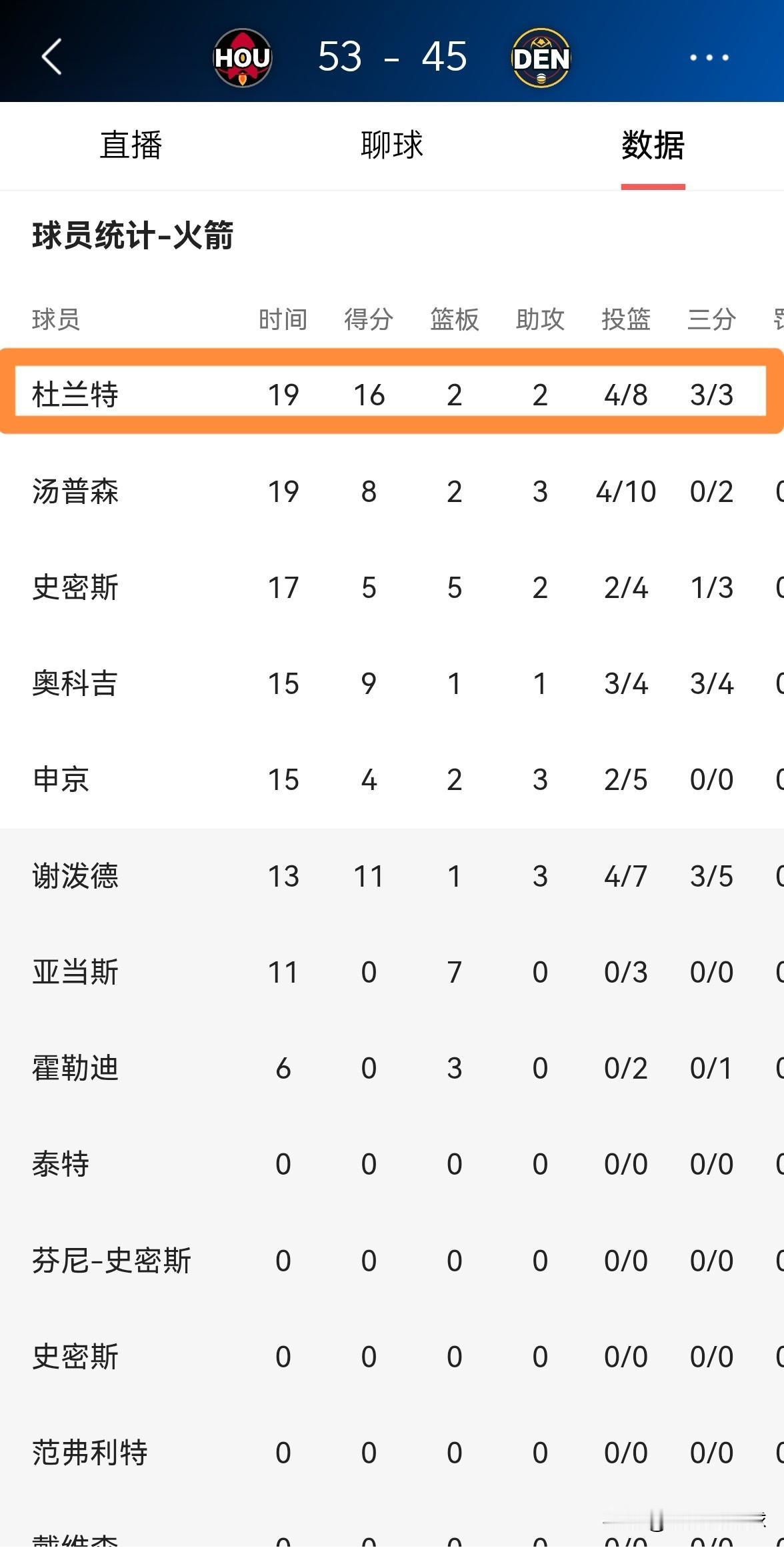 我彻底的被火箭巨星杜兰特打服了!在今天火箭客场挑战掘金的上半场比赛中,杜兰特将自己无与伦比的得分能力展现的淋漓尽致,对此我真是心服口服。 在前两节比赛中,杜兰特首发出战19分钟,投篮8中4,其中三分球3中3、罚球6中5轻松砍下16分2篮板2助攻1盖帽,他的场上正负值为+11,带领球队以53:45领先对手结束了前两节的比赛。 最让人感到不可思议的是,得分对于杜兰特来说真是太简单了,无论他面对谁的防守他都能得分。