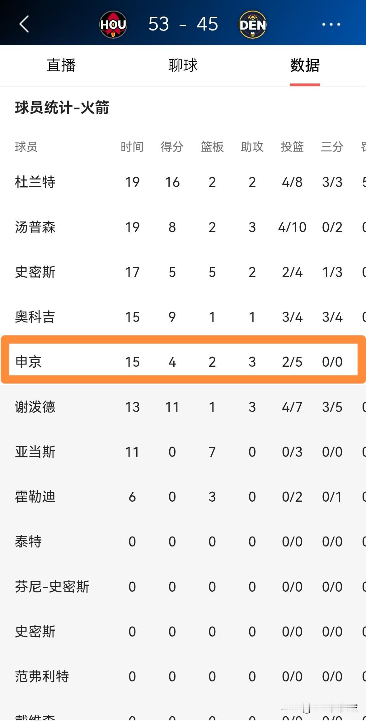 火箭超级中锋申京终于变聪明了!在今天火箭客场挑战掘金的上半场比赛中,申京在进攻端打得非常聪明,他不再一味地强攻,而是将出手机会留给了状态更好的队友。 在前两节比赛中,申京首发出战15分钟,投篮5中2得到4分2篮板3助攻1盖帽,他的场上正负值为+11。 坦白说,当申京以正确的方式打球时,火箭才能爆发出更强的威力,这样的话火箭才能攻无不克。