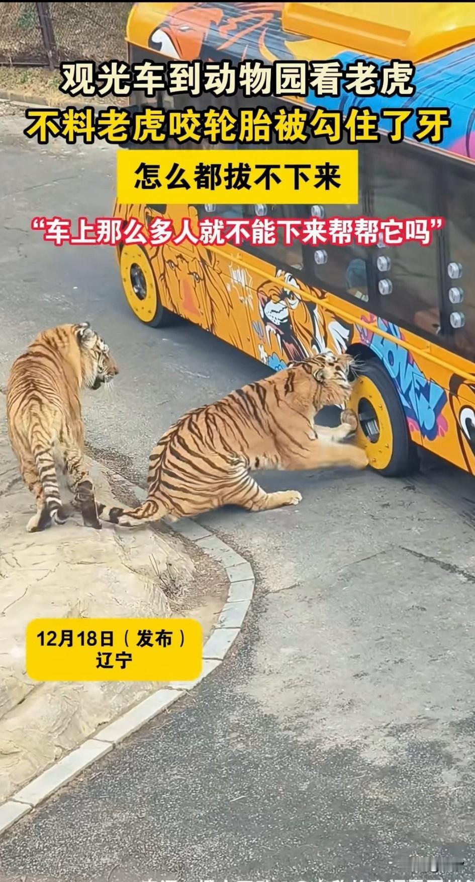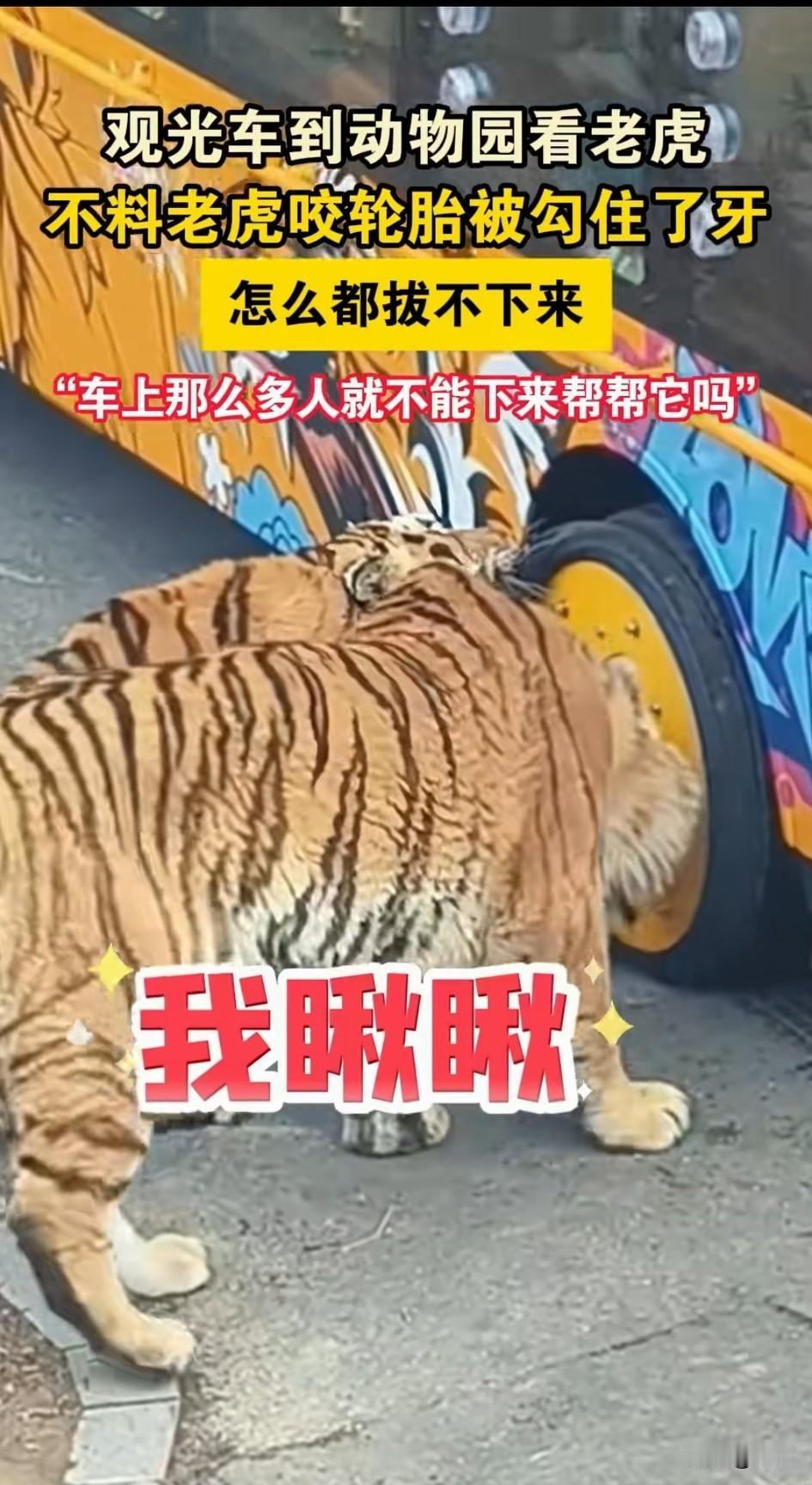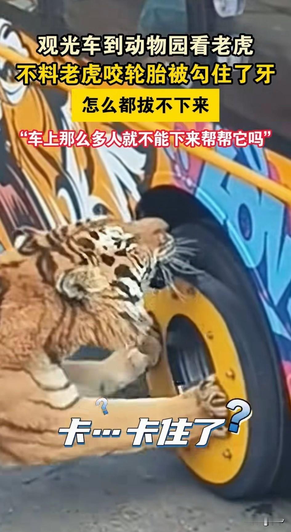 动物园的观光车进入猛兽区, 车上面的游客都在看老虎, 老虎也是很给面子, 居然主动上前打招呼, 虎啸龙吟让游客直呼刺激, 突然一只老虎, 对着车的轮胎咬了一口, 没想到牙齿居然拔不出来, 这老虎急的团团转, 用爪子扒着轮胎, 尝试了好多次都没有拔出来, 其他的老虎见状纷纷围了上来, 看了看后也是摇摇头, 还有一只老虎从后面扒到这只老虎身上,想要将老虎拽出来, 也没有成功, 网友表示车上人那么多, 都不知道下来帮帮忙, 大家对于这只老虎的遭遇怎么看? 动物园 动物园里的一景 公园老虎 动物园售票厅 广州动物园老虎 虎店动物园 合肥动物园老虎