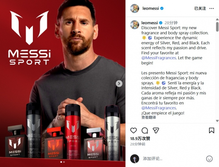 开拓新领域!梅西推出新款香水:每款香水都体现我的激情与进取心12月21日讯 梅西更新社媒,宣传自己的个人品牌Messi Sport推出新系列香水。配文:探索Messi Sport系列:我的全新香水与身体喷雾系列。🌟⚽️感受银色、红色与黑色款带来的动感活力与力量感。每一款香氛都体现着我的激情与进取心。快来MessiFragrances 找到属于你的最爱。比赛开始!