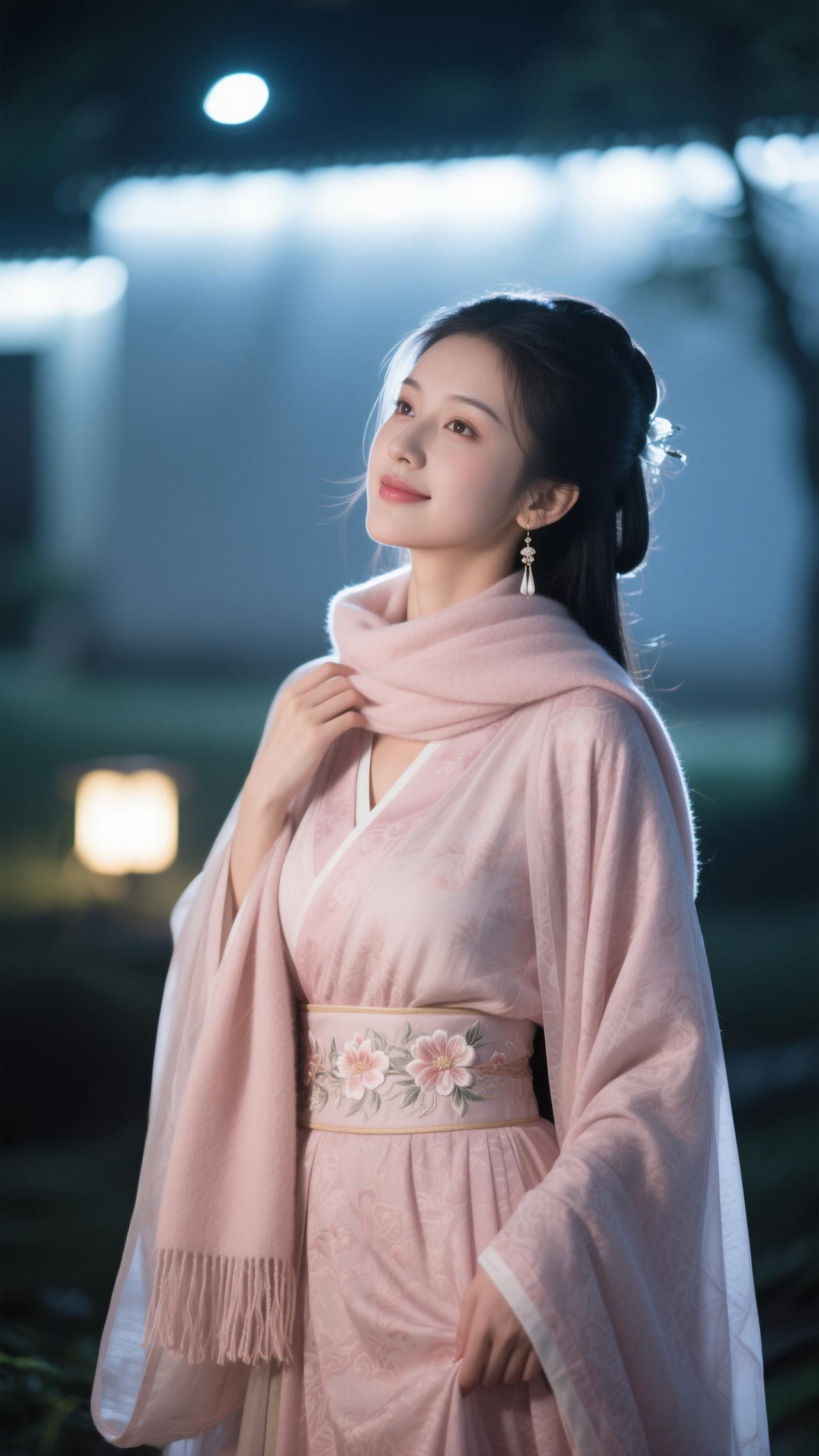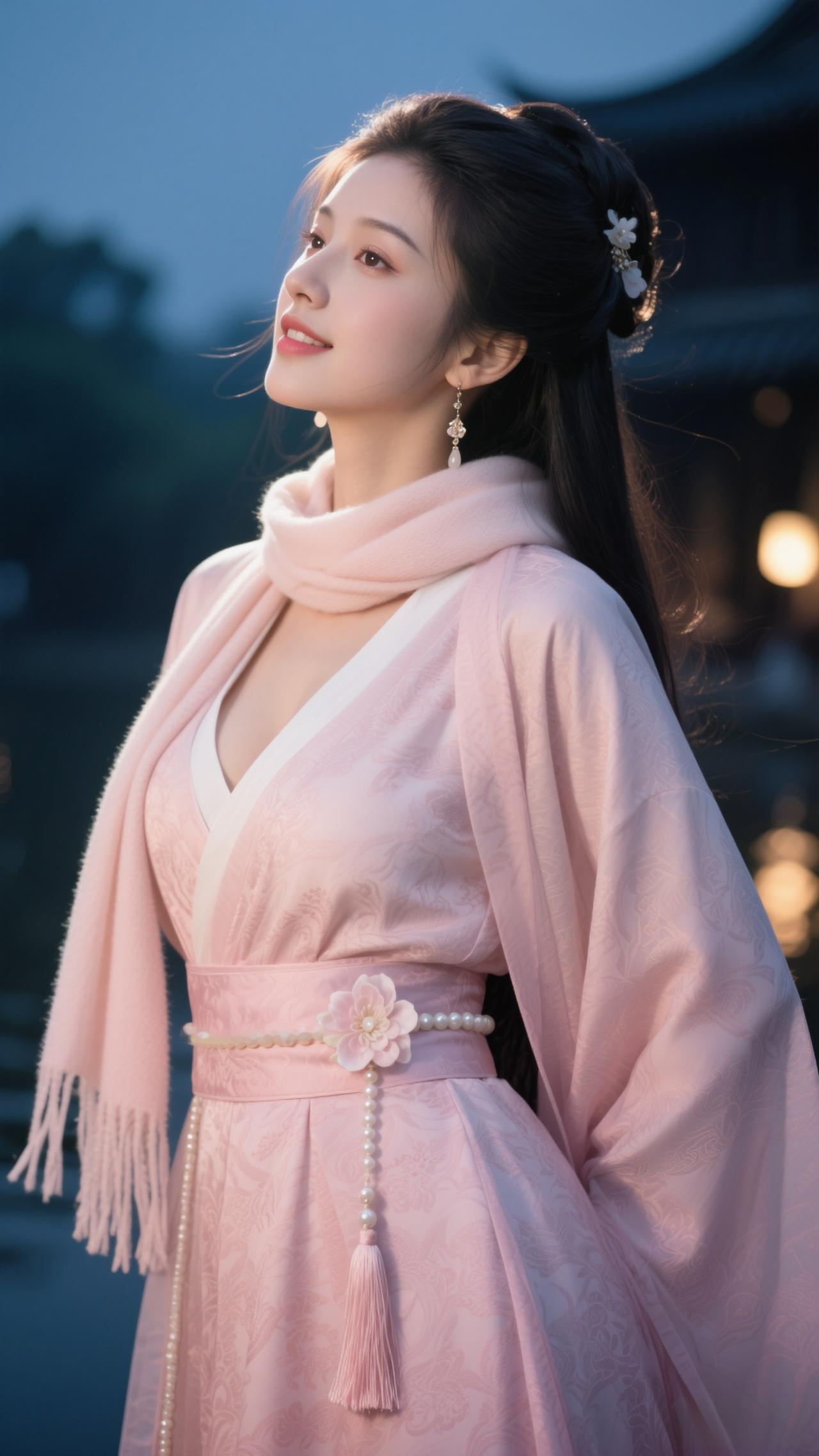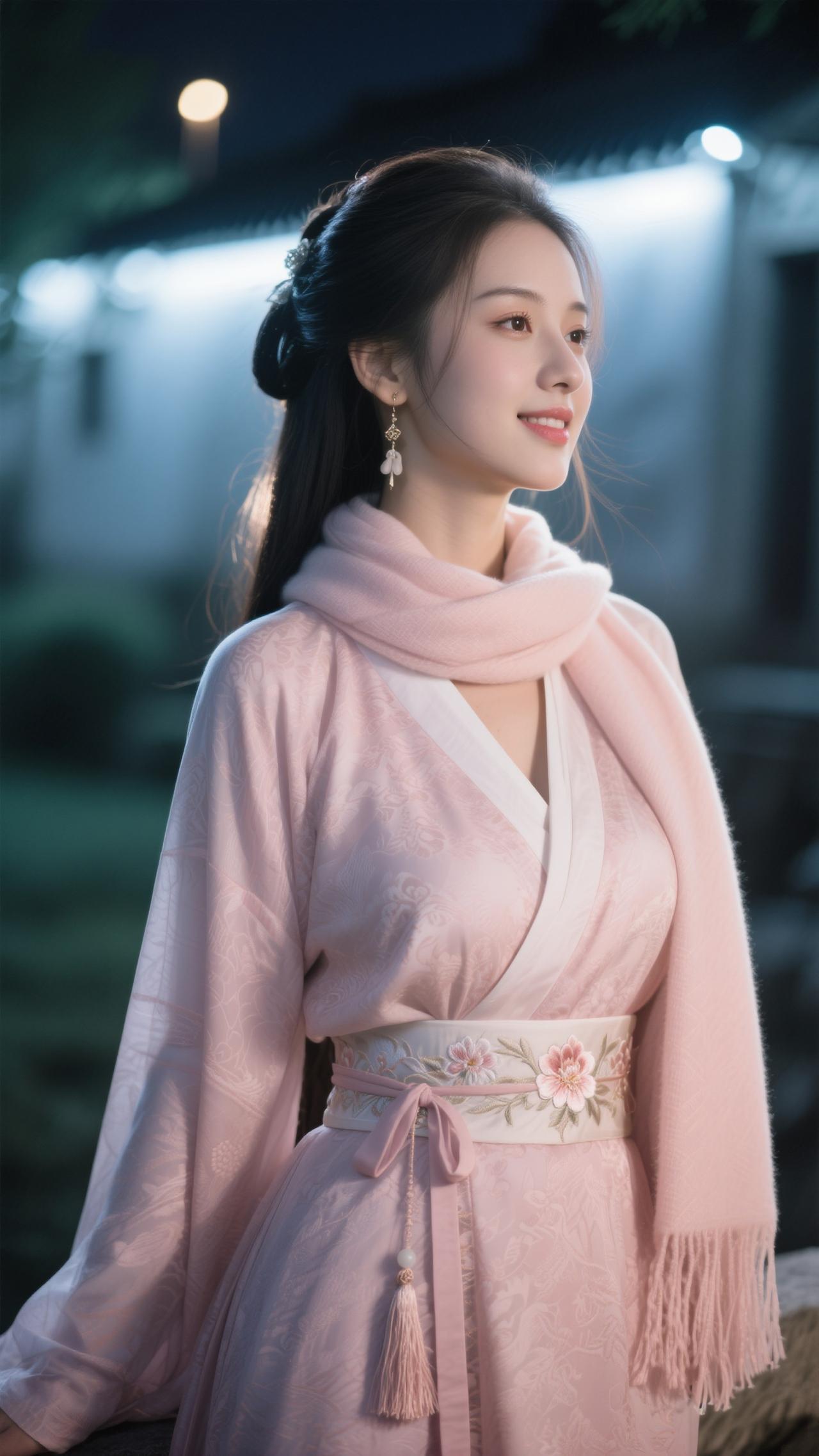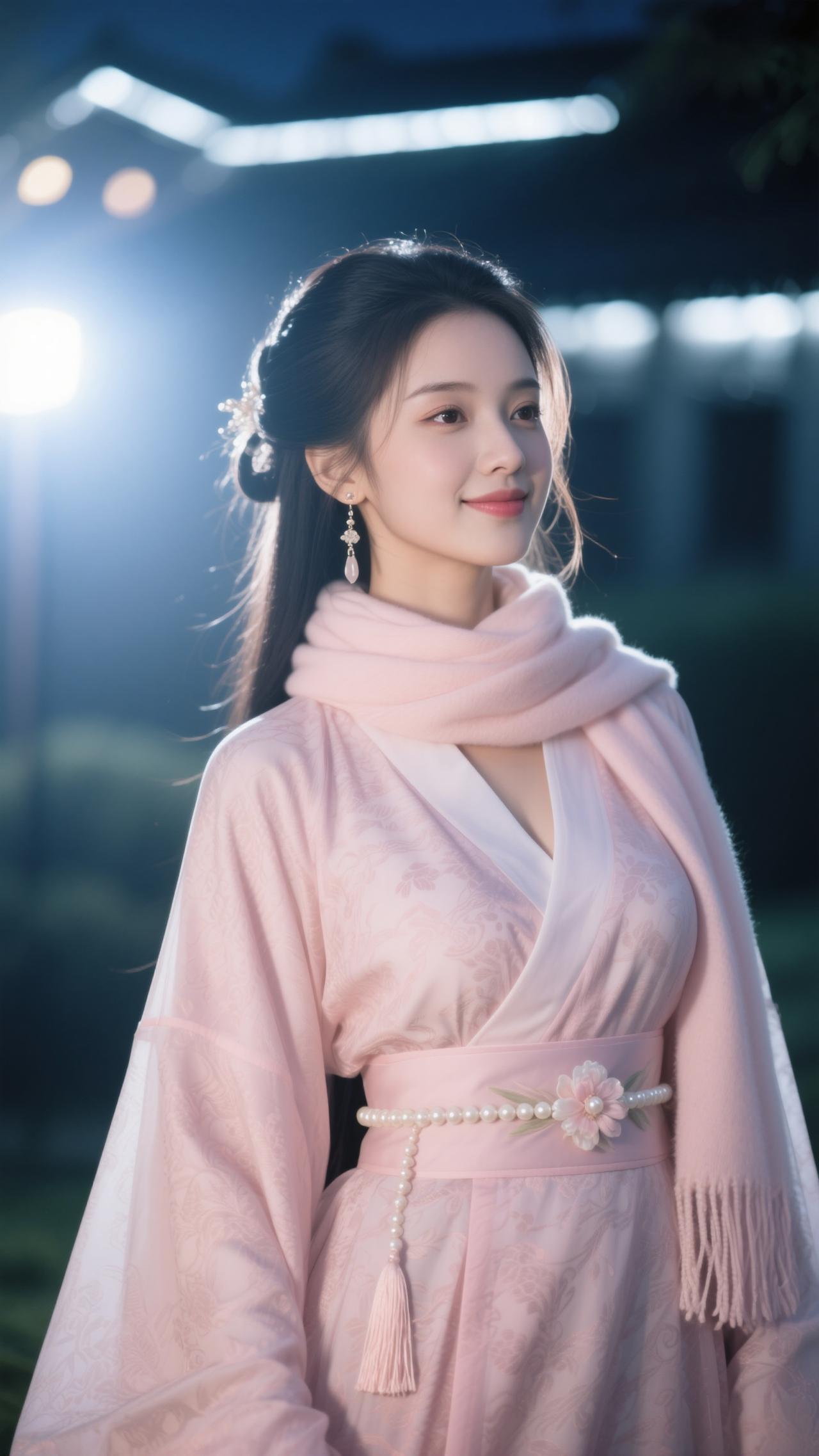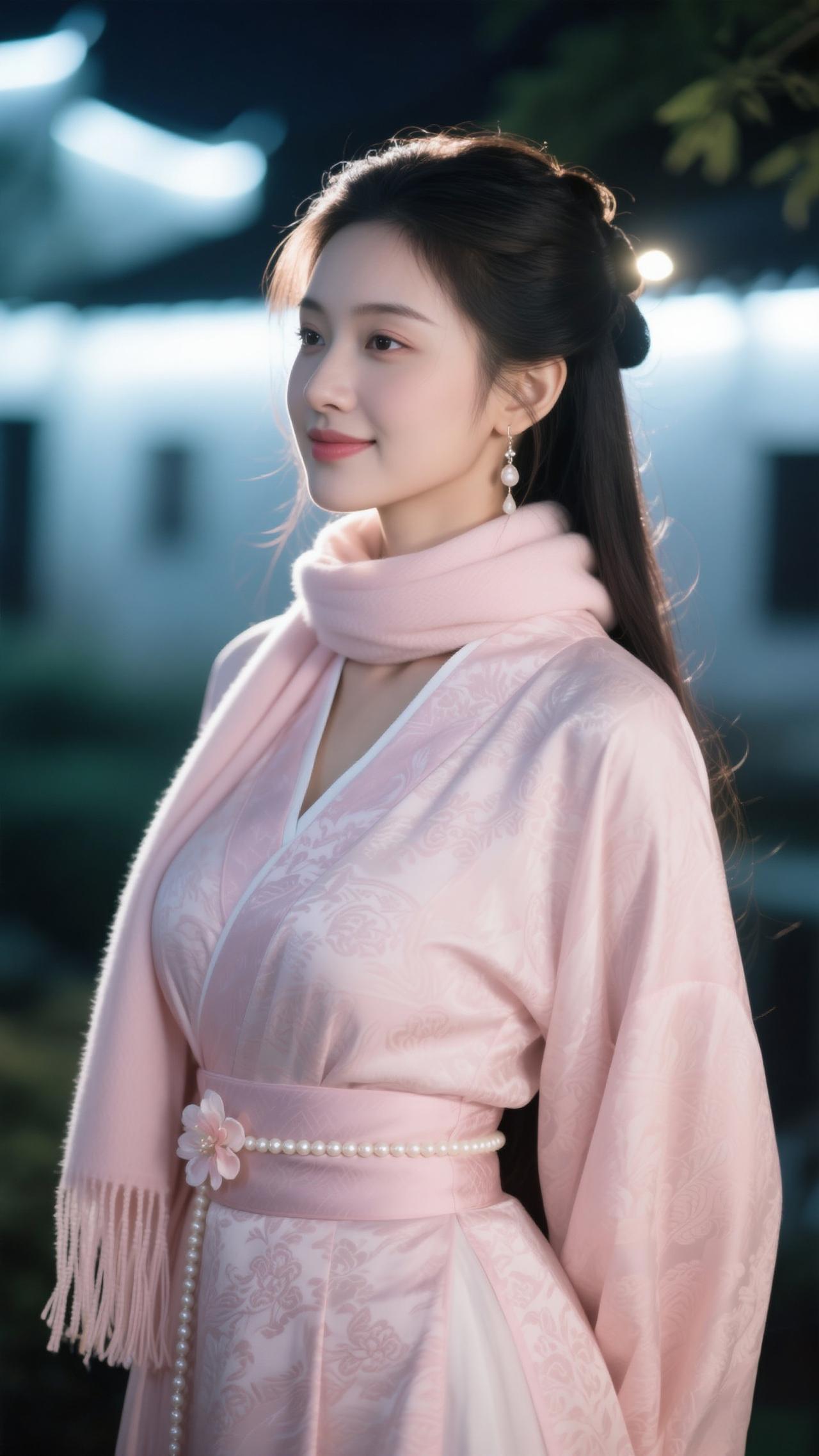 粉袂凝霜,夜灯斜照眉峰浅。 珠璎垂软,风拂流苏颤。 笑倚雕栏,一晌清欢远。 星影转,暗香盈袖,心似莲华软。