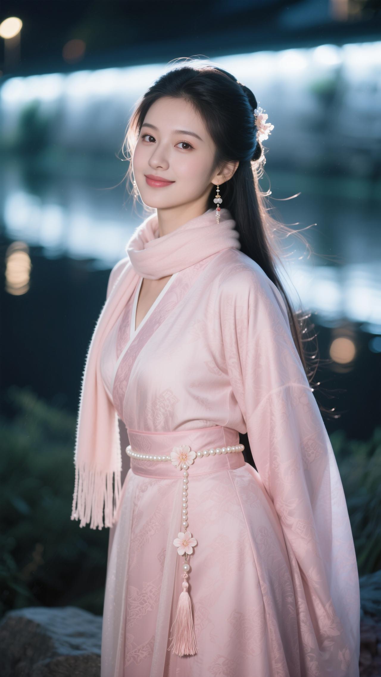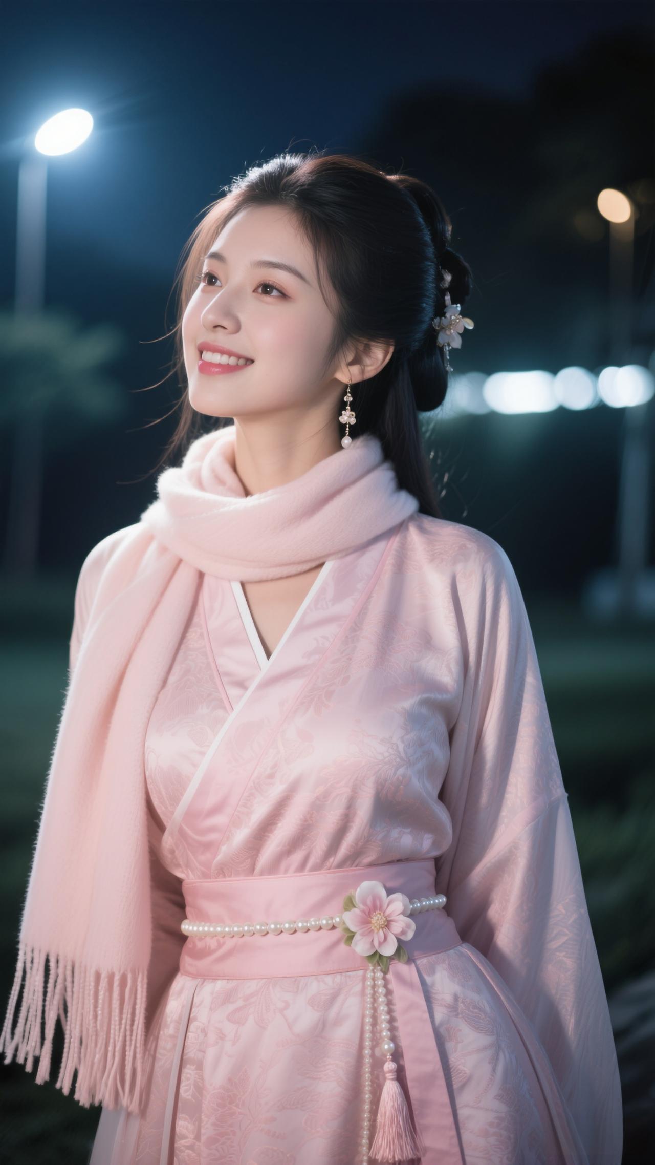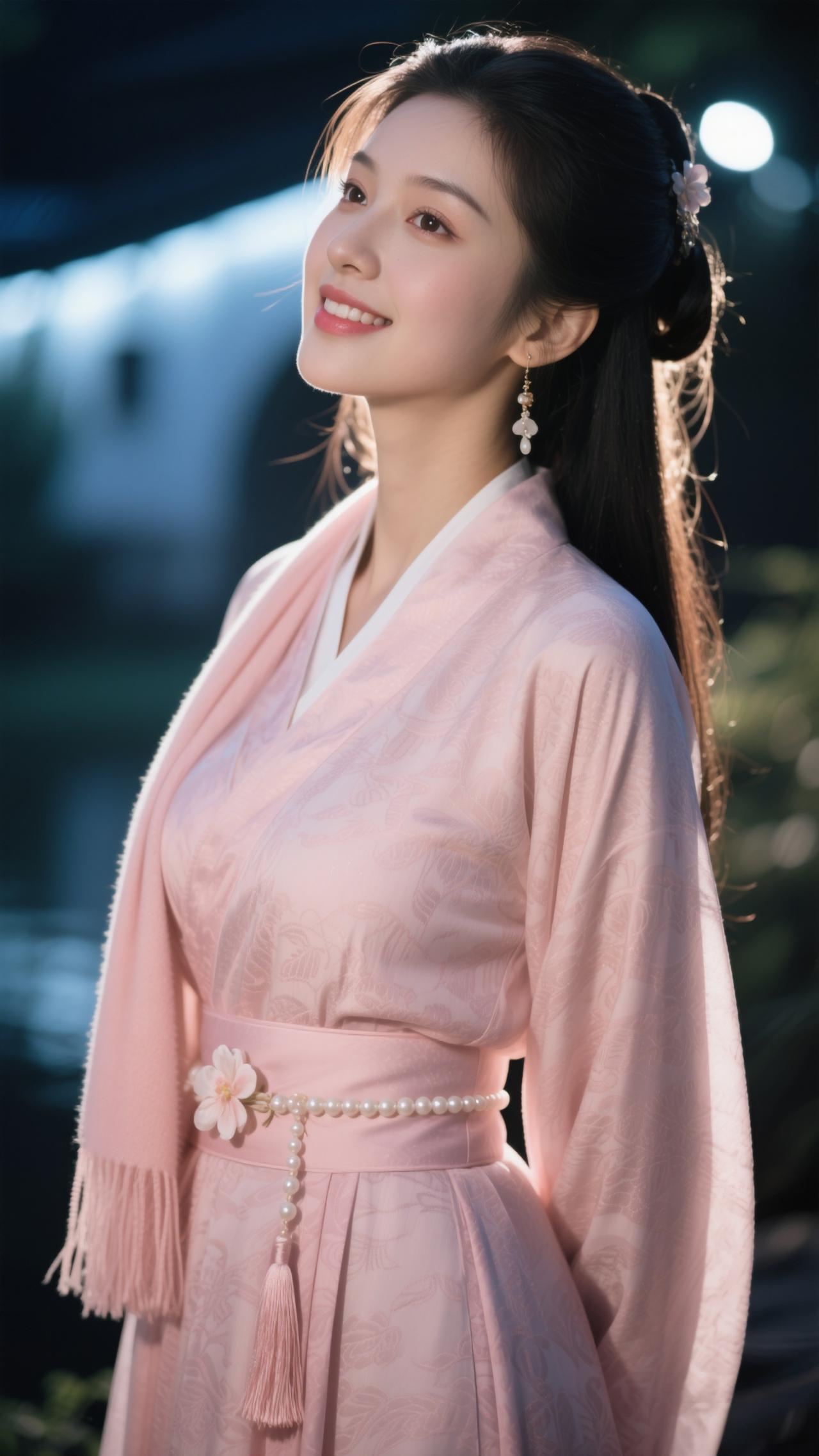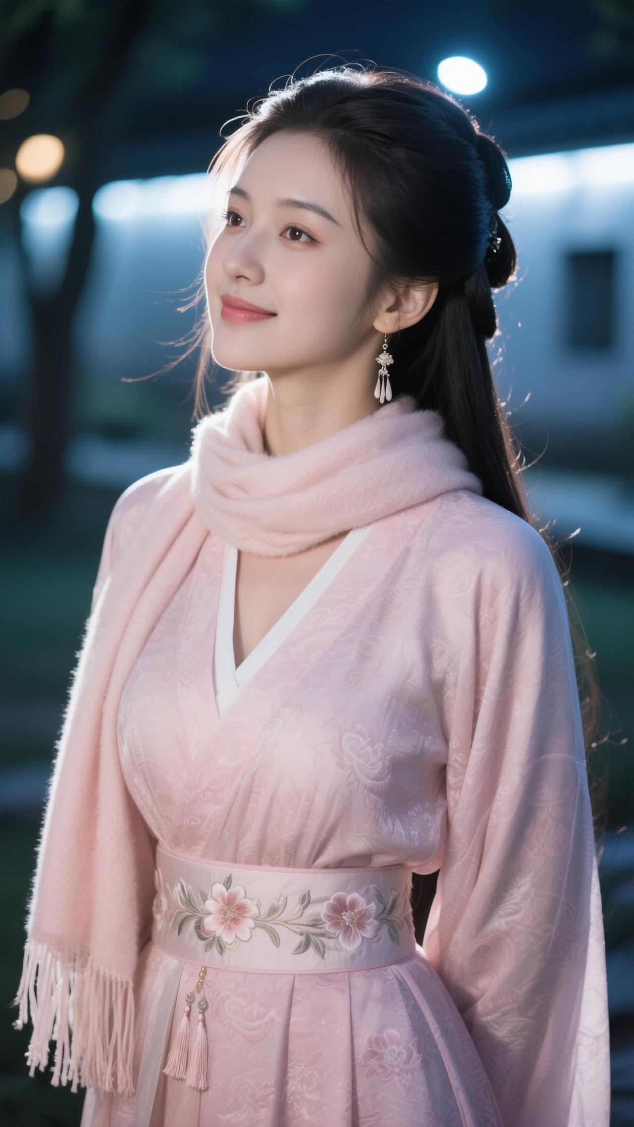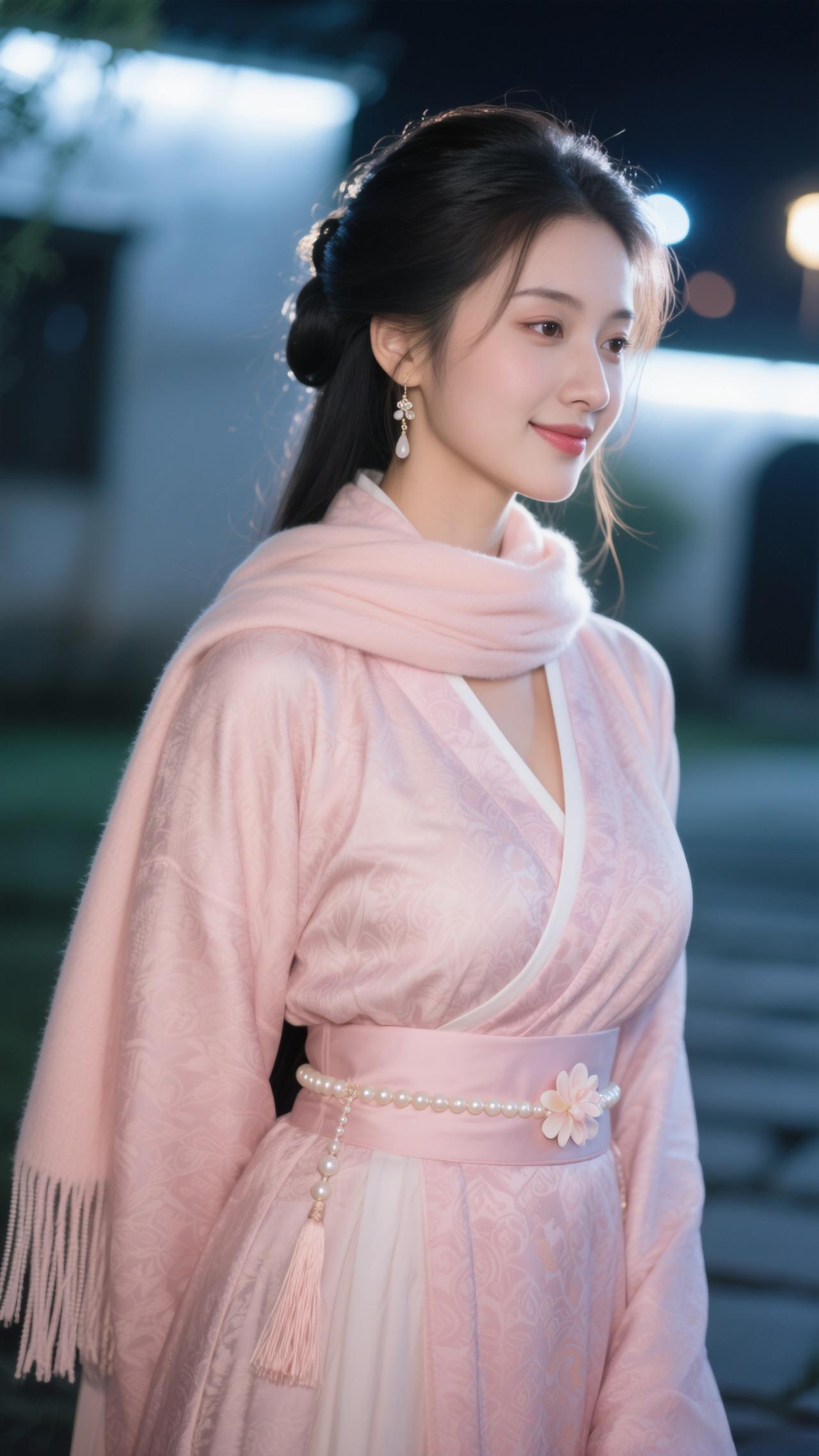 粉袂凝霜,夜灯斜照眉峰浅。 珠璎垂软,风拂流苏颤。 笑倚雕栏,一晌清欢远。 星影转,暗香盈袖,心似莲华软。