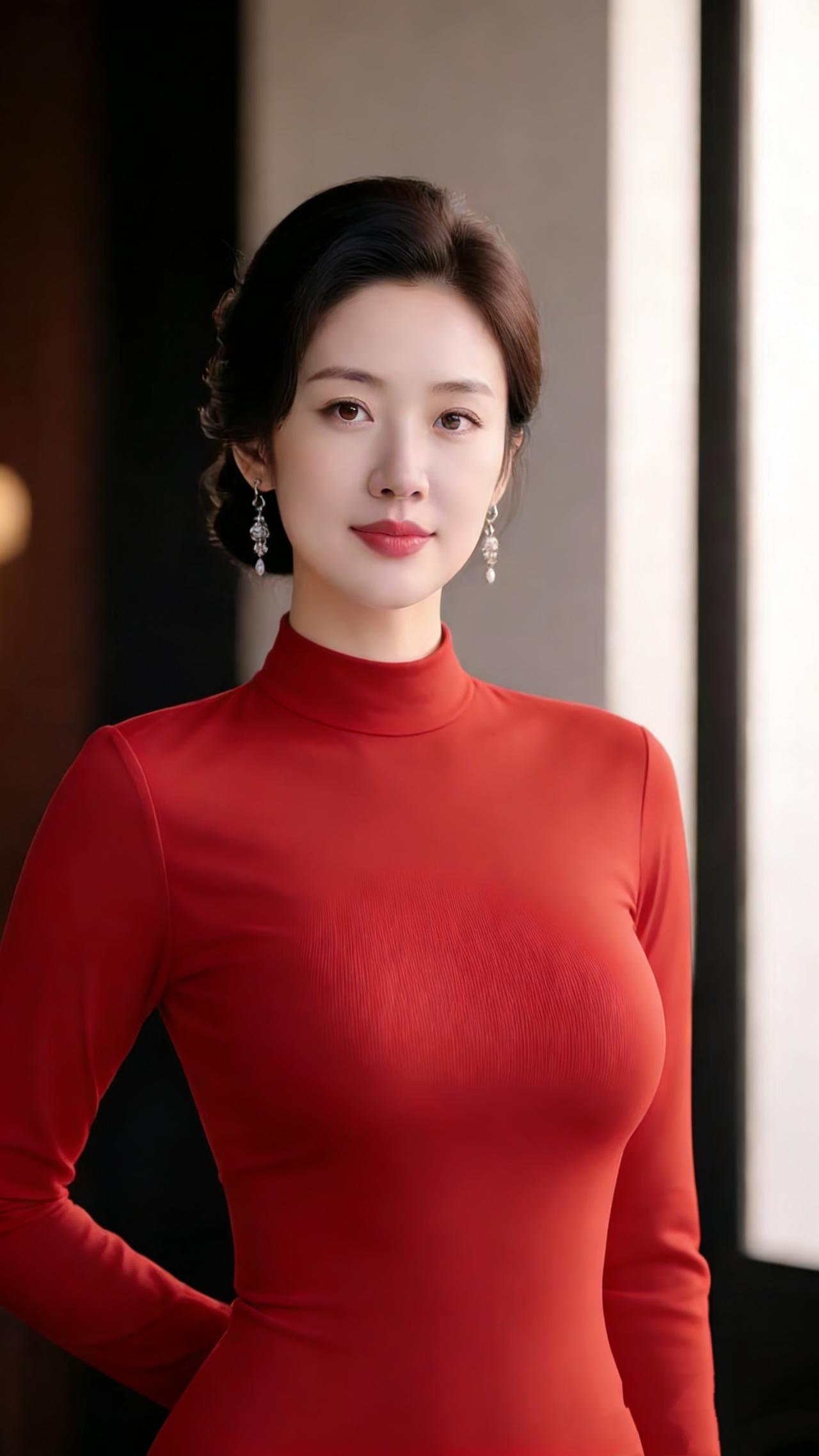 《红衣里的温软人间》 她着一身正红立于明暗之间,像把揉碎的日光织进了衣摆。 这红是妥帖的暖,不灼眼,只裹着舒展的平和——领口的弧度恰好衬出肩颈的舒展,耳坠轻晃时,似有细碎的风跟着柔了几分。她的神情是浅淡的,眼波落处,像春溪漫过石岸,温软得让周遭的烟火气都慢了下来。 这红该是藏着生活的吧?是晨光里轻叠的衣角,是暮色中温好的茶盏,是把寻常日子揉得松软的心意。她站在那里,没有张扬的姿态,却让人心生暖意:原来最动人的,从来是烟火里的舒展与温柔。 红衣舒展之美 日常里的温柔