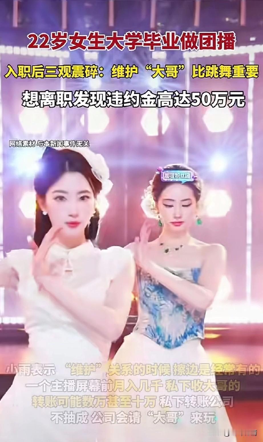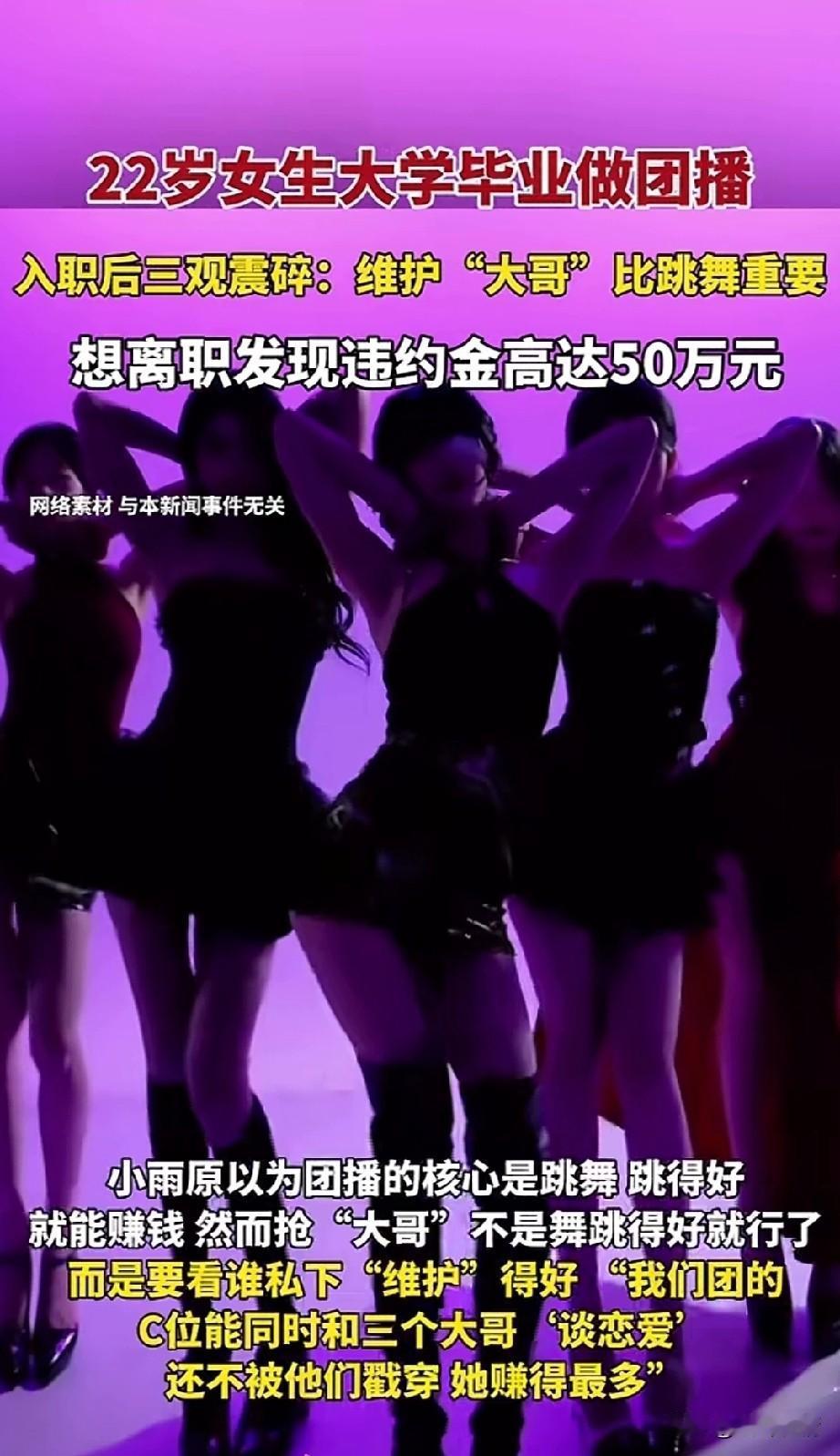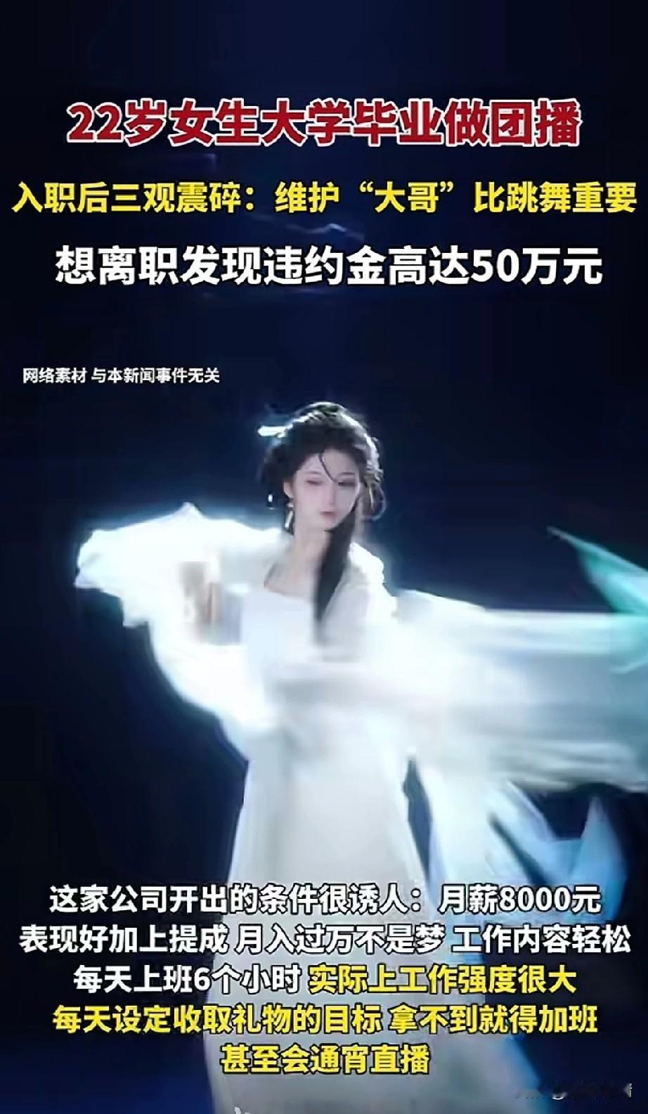 22岁的女生毕业后想当团播, 因为她看到那些团播赚钱很快, 而且每天相当的轻松, 在网络上也是风生水起, 于是就加入了一家团播公司, 公司提出的条件很诱人, 工资8000起步, 表现的好还有提成, 每个月轻松收入过万, 而且只需要播6个小时, 这让她毫不犹豫加入了, 进入公司后她才发现事情没有这么简单,团播不仅要跳的好, 私下维护和大哥的关系才是最重要的, 一个主播屏幕前收入几千块, 背后收到大哥转账10万甚至几十万, 这些都是要擦边的, 这就让她有些后悔了, 想要去离职, 公司告诉她需要交50万违约金, 团播的离职率非常高, 团队之间经常拆分,又合并, 这根本不是一件稳定的工作, 她提醒那些想要入行的女生, 签合同的时候一定要看清楚, 否则一旦进入公司想退出就难了, 这就是团播的现实, 以为普普通通拿高薪, 实际上却是一个巨大的陷阱, 一旦跳进去就很难爬出来, 大家对于团播这种野蛮生长的模式怎么看? 团播 团播模式 团播行业 团播利润 团播玩法 应届生当主播 团播直播公司