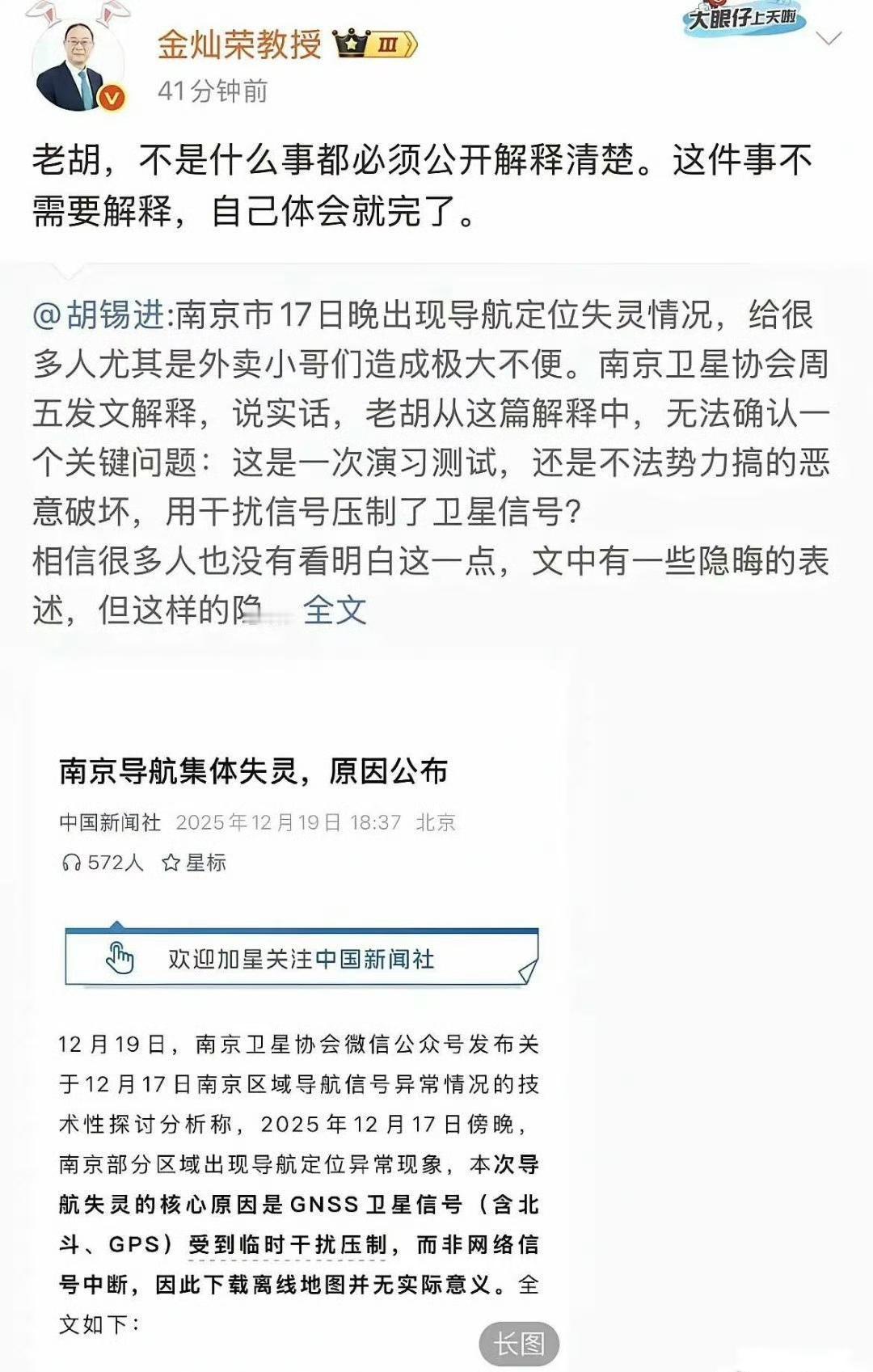 金灿荣喊话胡锡进: “老胡,不是什么事都必须公开解释清楚。这件事不需要解释,自己体会就完了。”看来南京导航失灵这事,金灿荣知道的内幕更多一些啊!
