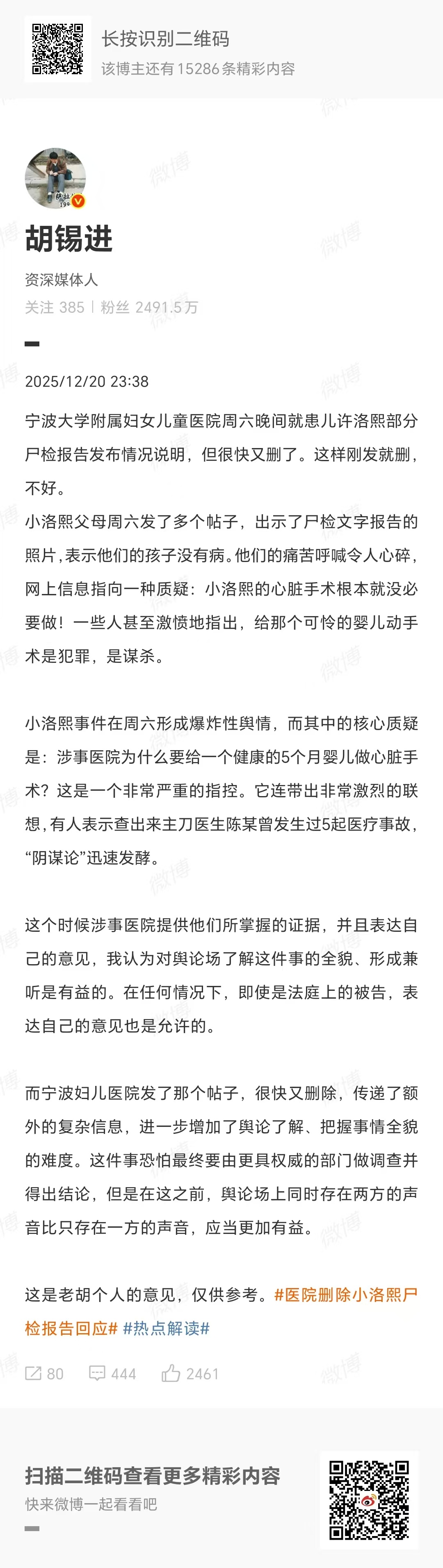 #胡锡进谈医院删除小洛熙尸检报告回应# 知名媒体人胡锡进发博:宁波大学附属妇女儿童医院周六晚间就患儿许洛熙部分尸检报告发布情况说明,但很快又删了。这样刚发就删,不好。小洛熙父母周六发了多个帖子,出示了尸检文字报告的照片,表示他们的孩子没有病。他们的痛苦呼喊令人心碎,网上信息指向一种质疑:小洛熙的心脏手术根本就没必要做!一些人甚至激愤地指出,给那个可怜的婴儿动手术是犯罪,是谋杀。小洛熙事件在周六形成爆炸性舆情,而其中的核心质疑是:涉事医院为什么要给一个健康的5个月婴儿做心脏手术?这是一个非常严重的指控。它连带出非常激烈的联想,有人表示查出来主刀医生陈某曾发生过5起医疗事故,“阴谋论”迅速发酵。这个时候涉事医院提供他们所掌握的证据,并且表达自己的意见,我认为对舆论场了解这件事的全貌、形成兼听是有益的。在任何情况下,即使是法庭上的被告,表达自己的意见也是允许的。而宁波妇儿医院发了那个帖子,很快又删除,传递了额外的复杂信息,进一步增加了舆论了解、把握事情全貌的难度。这件事恐怕最终要由更具权威的部门做调查并得出结论,但是在这之前,舆论场上同时存在两方的声音比只存在一方的声音,应当更加有益。这是老胡个人的意见,仅供参考。#院方称小洛熙房缺1cm左右##三甲医生谈小洛熙事件5大疑问##医院删除小洛熙尸检报告回应#
