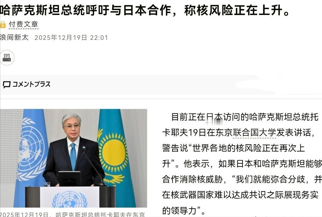 托卡耶夫这一番讲话,高市早苗估计脸上都挂不住了!托卡耶夫黑不提,白不提,偏偏在日本国内传出要拥核的时候,托卡耶夫呼吁要与日本在消除核威胁方面进行合作!12月20日,根据日媒报道,正在日本访问的哈萨克斯坦总统托卡耶夫在日本的一所大学发表讲话称,世界各地的核风险正在再次上升。 12月20日,正在日本访问的托卡耶夫在一所日本大学发表演讲,没提双方经济合作的大好前景,没聊地缘政治的复杂博弈,偏偏重点强调“世界各地的核风险正在再次上升”,还公开呼吁要与日本在消除核威胁方面深化合作。 这时间选得实在太微妙了,要知道就在两天前的 12 月 18 日,高市早苗政府里一位负责安保政策的高官,在首相官邸以 “个人观点” 的名义对记者团放话,宣称 “日本应当拥有核武器”。 这番言论直接突破了日本坚持多年的核政策底线,瞬间在国内外掀起轩然大波,连日本国内的原子弹受害者团体都愤怒发声,说这是在给他们 80 年来反对核武器的努力泼冷水。 而高市早苗本人此前在国会答辩时,被问到是否坚持 “不拥有、不制造、不引进” 的无核三原则时,也一直回避明确表态,甚至有消息说她的内阁正考虑在修订安保文件时,抛弃 “不运进核武器” 的原则。 托卡耶夫会如此关注核问题绝非偶然,哈萨克斯坦可是核危害的直接受害者。当年苏联时期,曾在哈萨克斯坦的塞米巴拉金斯克核试验场进行过超过 450 次核试验,导致超过一百万人长期暴露在核辐射之下,这片土地至今还残留着核污染的痕迹。 正因为有这样的历史伤痛,哈萨克斯坦一直是全球核裁军和防扩散的积极推动者,托卡耶夫此时在日本提 “消除核威胁”,无疑是站在道义制高点上的表态。 更有意思的是,这次托卡耶夫访日,日本原本抱着很强的拉拢目的。12 月 19 日,日本刚主办了 “中亚五国 + 日本峰会”,高市早苗政府对托卡耶夫给予了极高礼遇,双方一口气签署了 14 份双边合作文件,涉及资源能源、基建物流、数字智能等多个领域。 日本之所以这么积极,核心是看中了哈萨克斯坦的战略资源 —— 该国铀产量占全球 40% 以上,还是稀土、锂等 22 种日本绿色技术关键原材料的供应国,对日本的能源安全和供应链稳定至关重要。 可托卡耶夫显然没顺着日本的思路走,虽然签署了经济合作文件,但所有合作都严格限定在经济技术领域,完全不涉及政治军事捆绑,直接避开了日本想借合作制衡中俄的战略野心。 如今再公开呼吁合作消除核威胁,等于是在全日本面前给高市早苗的拥核试探敲了警钟。面对这突如其来的表态,日本内阁官房长官只能尴尬重申政府坚持无核三原则的立场,却对涉事官员的处理和言论撤回问题避而不谈。 其实日本国内的拥核讨论早有苗头,2011 年自民党就曾提出 “无核 2.5 原则”,想允许搭载核武器的美军舰艇停靠日本港口。 而现在日本作为 “核门槛国家”,在核技术和原材料储备上都已具备制造核武器的能力,缺的只是政治和法律上的许可。 这次高官公然喊出拥核,被外界看作是为突破无核三原则的试探。托卡耶夫的讲话,恰好戳中了日本核政策的敏感神经,也让这场本就充满争议的讨论,多了一层国际社会的审视压力。 无论托卡耶夫是顺势而为,还是有心卡点,其客观效果都妙不可言。这番话,听在日本耳朵里,恐怕格外刺耳;但听在国际社会,尤其是那些坚定维护核不扩散体系的国家耳中,无疑值得一个响亮的赞同。