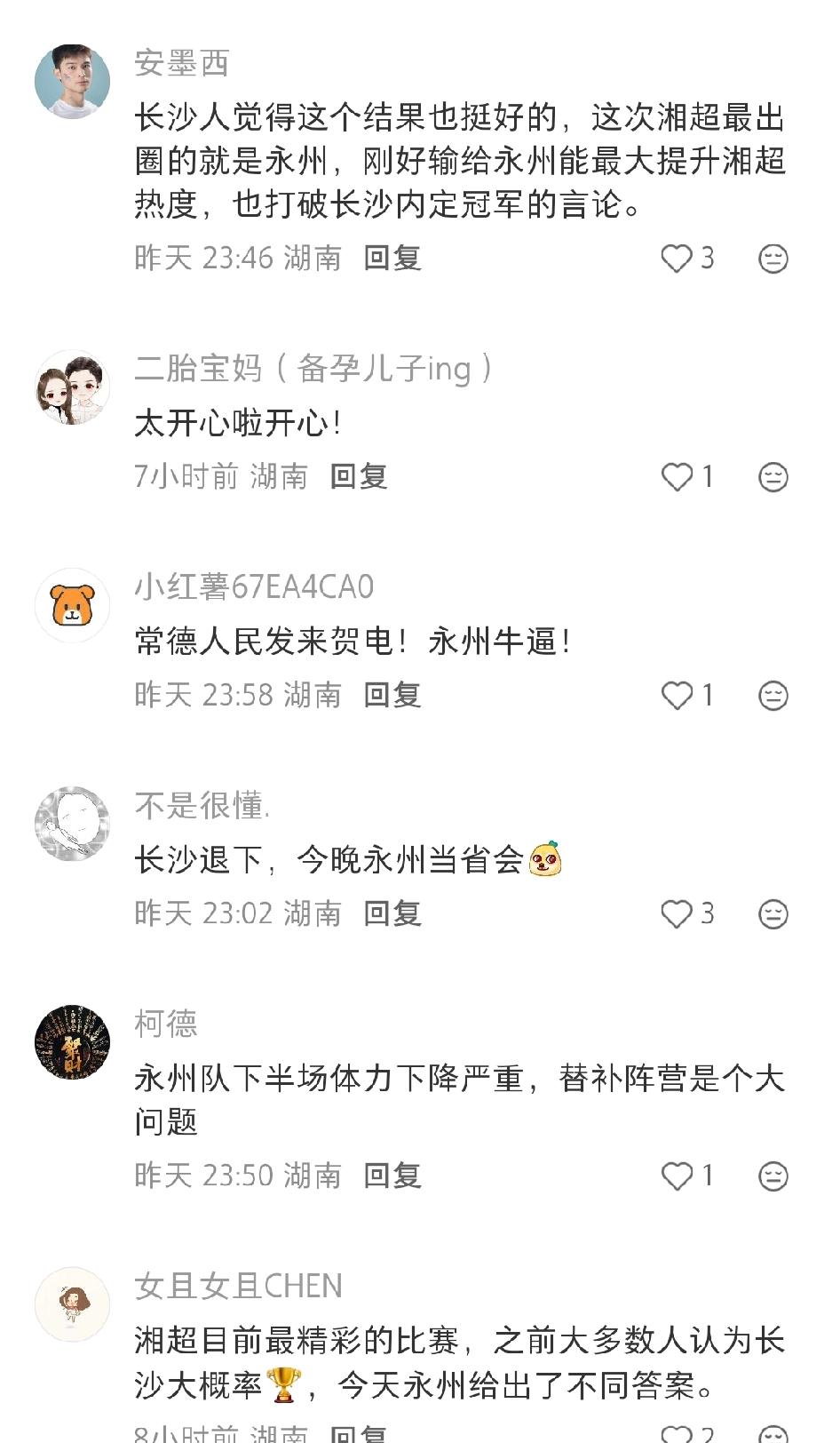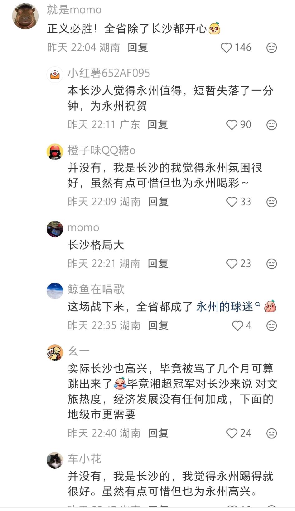 湘超长沙主场输给了永州,没想到湖南人民都很开心、很和谐。 永州不用多说,是最开心的,昨天就是永州的节日。 其他几个市也很开心,毕竟长沙不再是不可战胜了。 就连输球的长沙,也意外的淡定,起码赚到了永州球迷的钱。