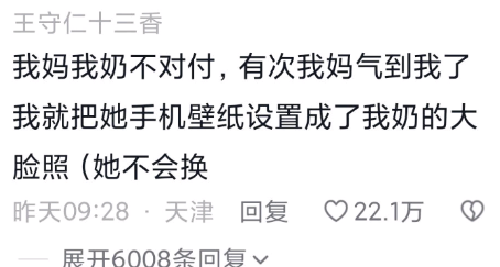 我妈我奶不对付,有次我妈气到我了我就把她手机壁纸设置成了我奶的大脸照(她不会换)