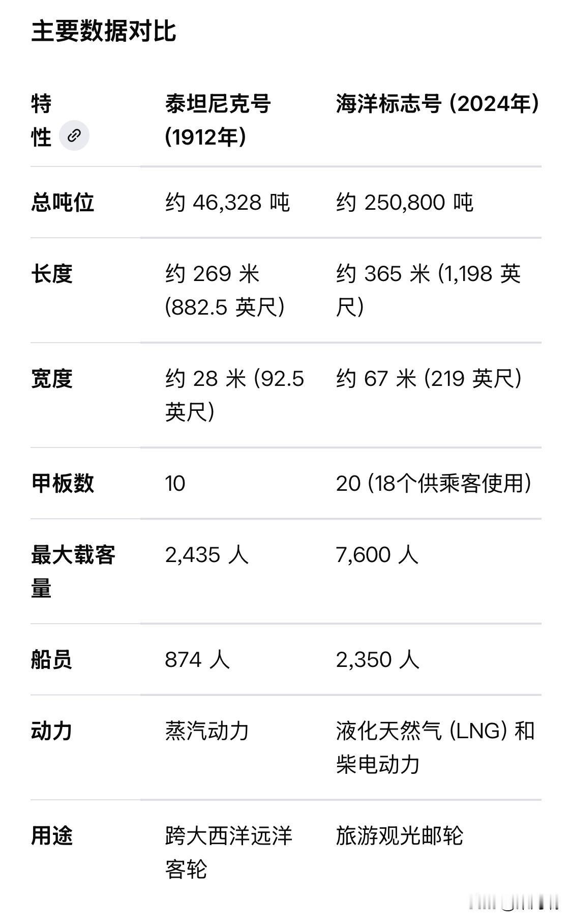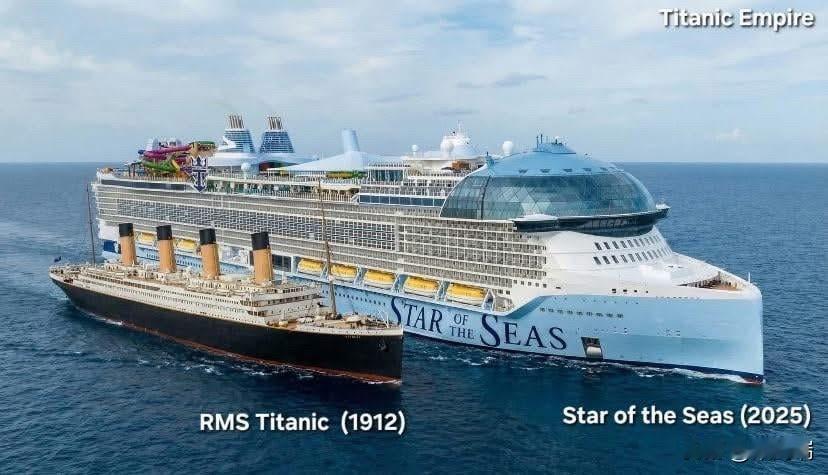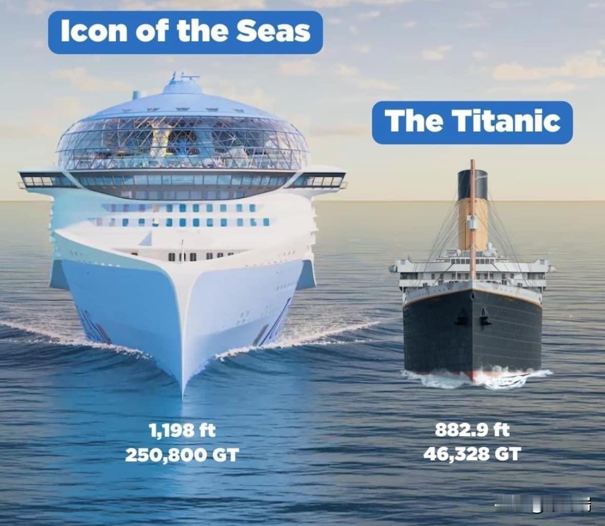 皇家加勒比国际(Royal Caribbean International)旗下的“海洋标志号”(Icon of the Seas)在尺寸和吨位上都大大超过了“泰坦尼克号”(Titanic),体现了一个世纪以来造船技术的巨大进步。 主要区别 尺寸与容量: “海洋标志号”的体积约为“泰坦尼克号”的五倍半。其载客量和船员数量也远超后者。 设计与技术: “泰坦尼克号”在当时是工程杰作,但缺乏许多现代安全特性,例如没有足够的救生艇供所有船上人员使用。相比之下,“海洋标志号”采用先进的钢合金和现代技术建造,配备了最先进的导航、天气跟踪和安全系统,完全符合严格的国际海洋安全法规。 目的与设施: “泰坦尼克号”的主要功能是跨洋运输,强调奢华的内饰和一流的服务。而“海洋标志号”是一座“海上浮动城市”,旨在提供极致的度假体验,拥有海上最大的水上乐园、多个泳池、溜冰场、攀岩墙和众多餐厅等娱乐设施。