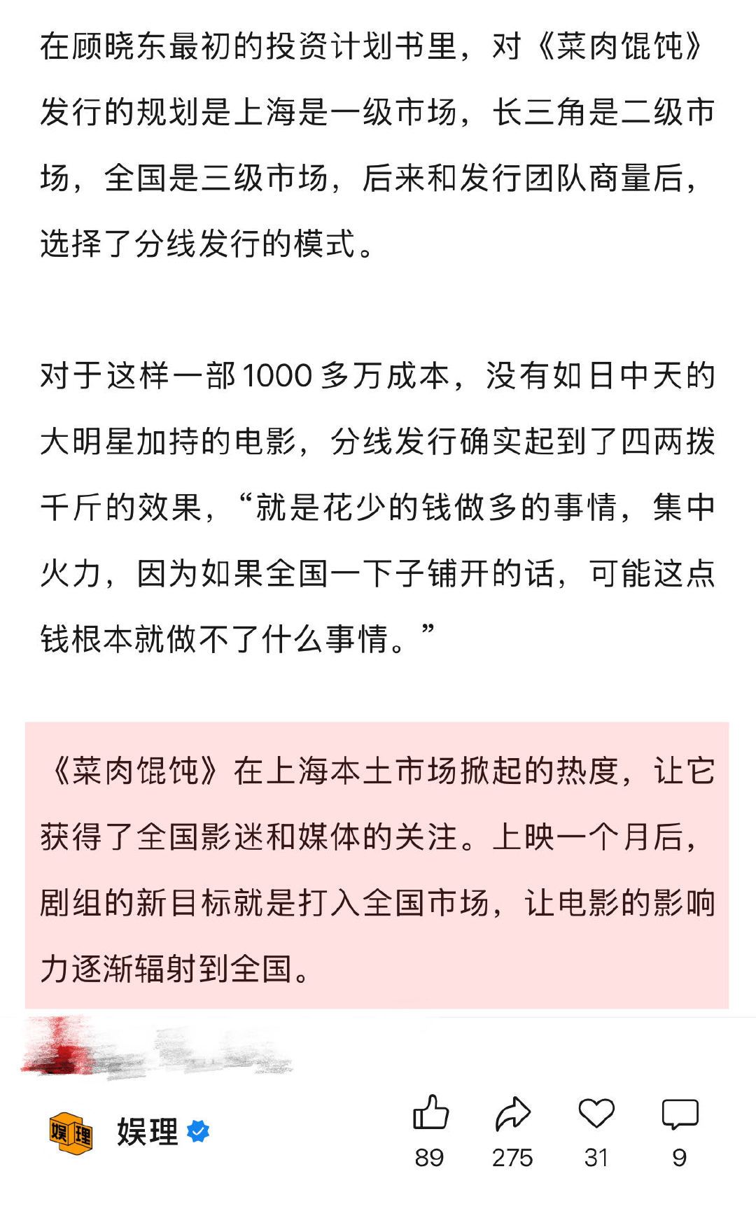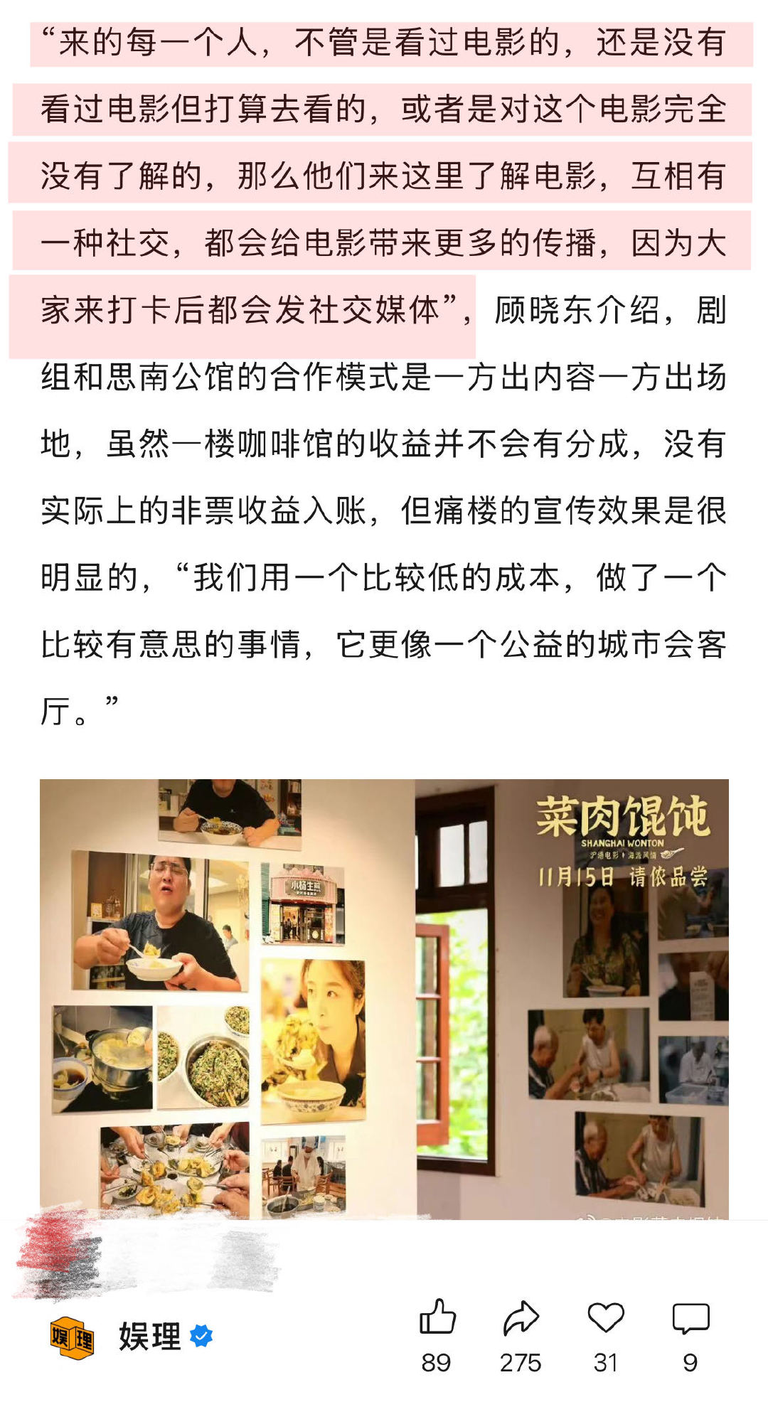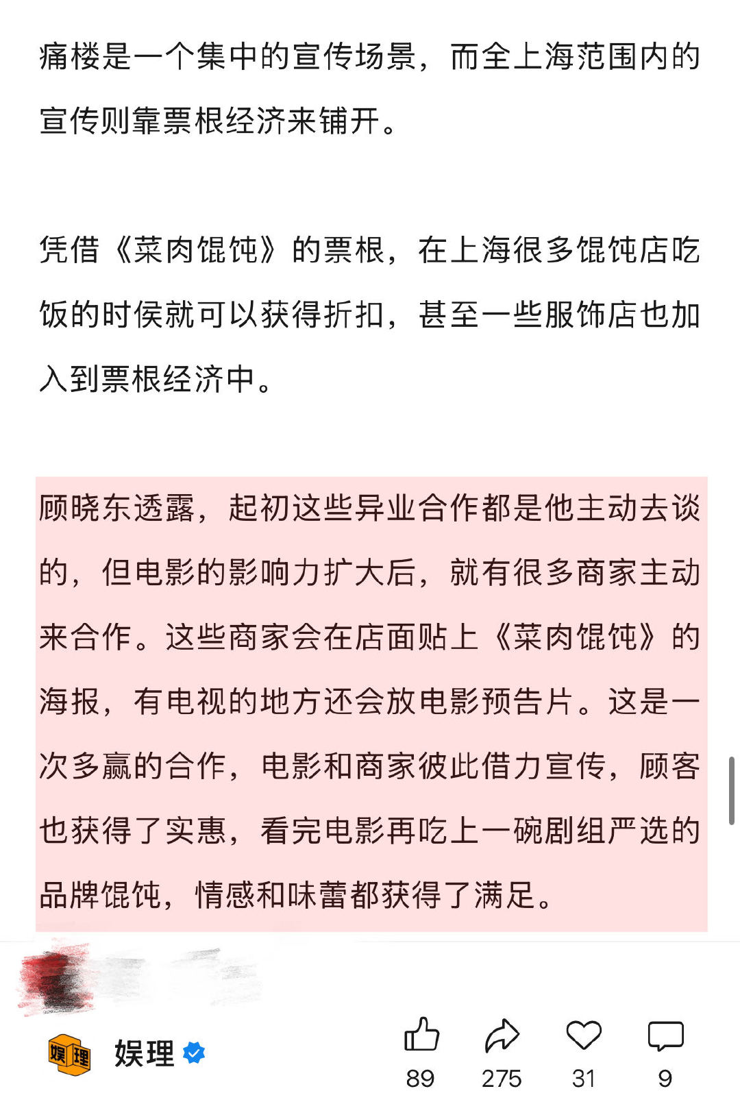菜肉馄饨做对了什么主创回应菜肉馄饨为何能小爆 凭借《菜肉馄饨》的票根,在上海很多馄饨店吃饭的时侯就可以获得折扣,甚至一些服饰店也加入到票根经济中。据制片人顾晓东透露,起初这些异业合作都是他主动去谈的,但电影的影响力扩大后,就有很多商家主动来合作。这是一次多赢的合作,电影和商家彼此借力宣传,顾客也获得了实惠…娱理独家↓