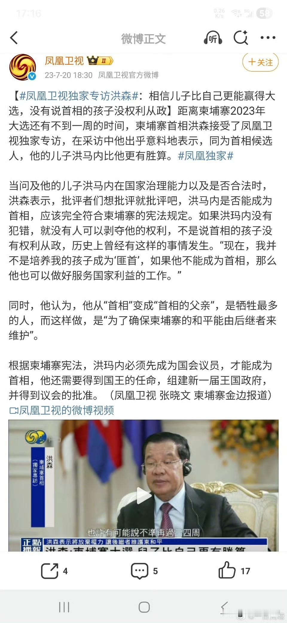 前年凤凰卫视独家专访洪森的文章! 洪森认为从“首相”变成“首相的父亲”是牺牲最多的人!
