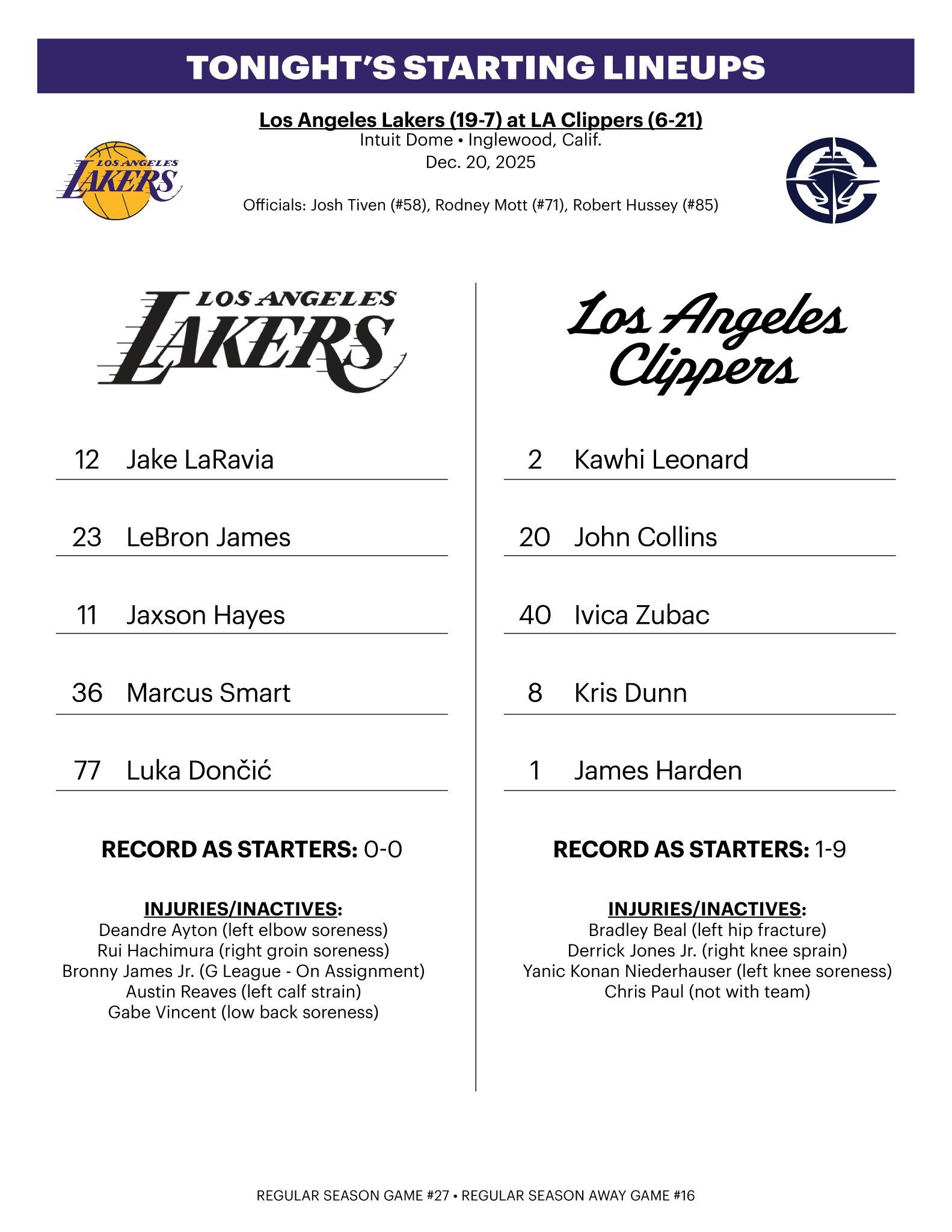 拉拉维亚进入首发名单!今日首发: 东契奇,詹姆斯,海斯,斯玛特,拉拉维亚!湖人vs快船洛杉矶湖人洛城德比