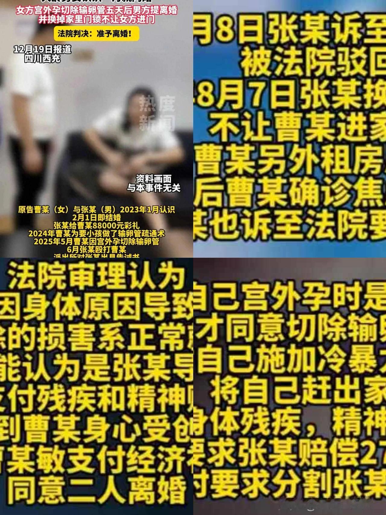 大龄男女认识一月闪婚,女方宫外孕切除输卵管,五天后男方提出离婚,并换掉门锁不让女方进门,太狠了—— 刚躺手术台切掉双侧输卵管, 转头就被丈夫换锁赶出家门, 这婚结得简直是场灾难! 曹女士和张某认识才30天就领证, 本以为撞了桃花运, 没想到踩了无底坑。 婚后为了怀孕, 她挨了输卵管疏通术, 结果宫外孕大出血, 双侧输卵管全被切除。 伤口还没拆线, 丈夫的拳头就落了下来,派出所都发了告诫书。 第一次起诉离婚没成, 这男人更绝了! 直接换掉家里门锁, 把术后虚弱的她扔在外面自生自灭。 曹女士只能独自租房住,硬生生熬出重度抑郁。 她索赔27万, 结果法院只给了3万多的酌情补偿。 法律只认身体的伤, 却不认这冷暴力扎的心窟窿。 这场仓促的婚姻, 夺走了她的生育能力, 也撕碎了她对爱情的所有幻想。 说到底, 闪婚闪的是眼泪, 坑的是她一辈子! 对此您怎么看? 评论区唠唠! 社会新闻 婚姻警示 女性保护输卵管堵塞 宫外孕
