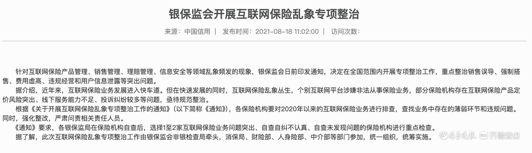 针对互联网保险出现的问题,2021年8月,中国银保监会曾发布《中国银保监会办公厅关于开展互联网保险乱象专项整治工作的通知》,明确表示将对销售误导、强制搭售、诱导销售以及非法经营等4方面25项问题进行全面整治。此后,北京、宁夏等多地银保监局持续大力整治互联网保险营销宣传乱象。