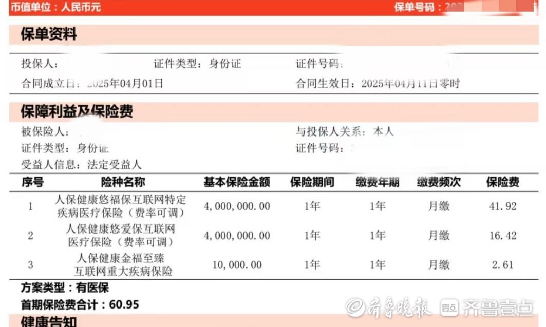 根据李先生提供的保单截图显示,其“被投保”的好医保·长期医疗(旗舰版)隶属于中国人民健康保险有限股份公司,包含保健康悠福保互联网特定疾病医疗保险、人保健康悠福保互联网医疗保险、人保健康金福至臻互联网重大疾病保险三个险种,累计保险金额为410万元,缴费年期一年,按月缴纳,生效日为2025年4月11日。