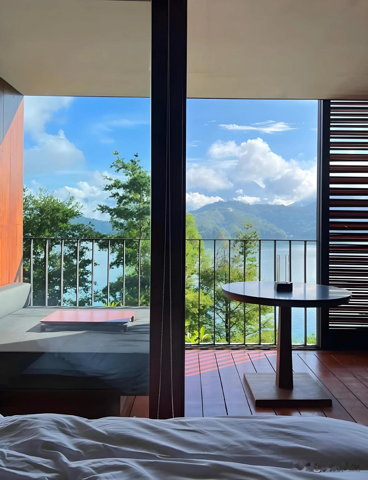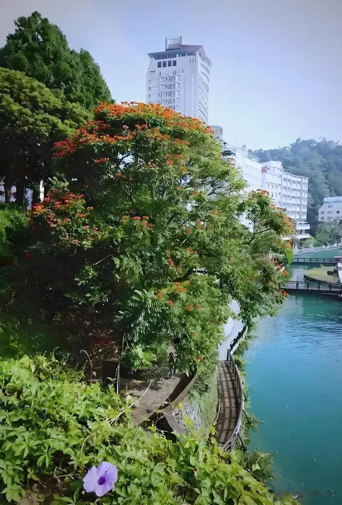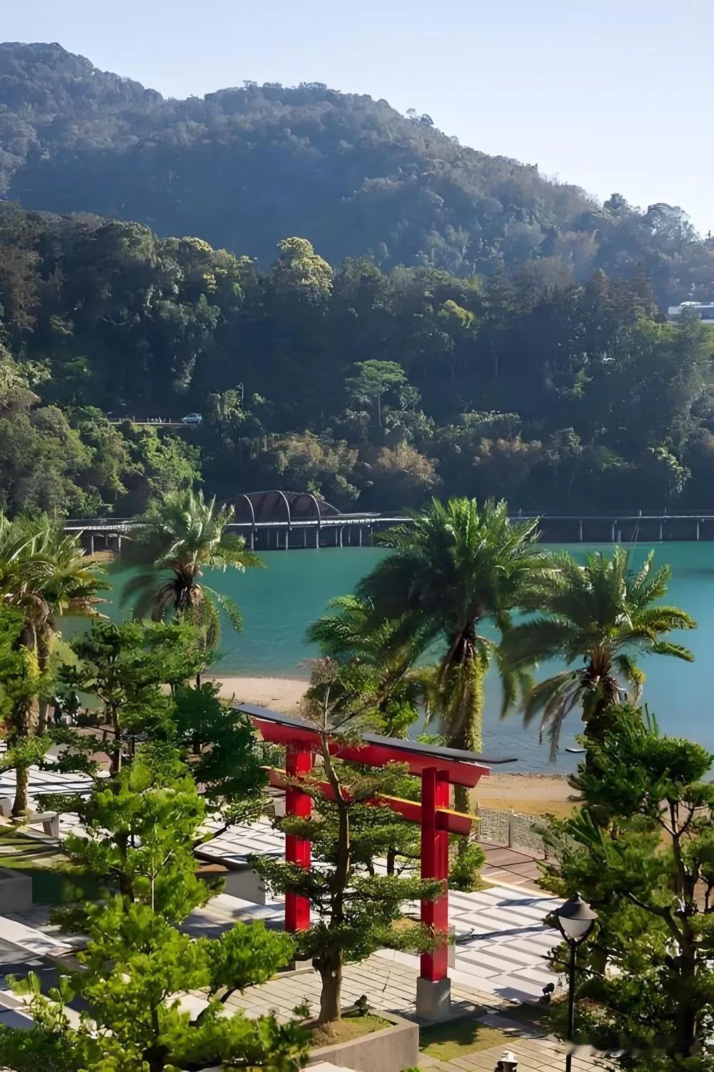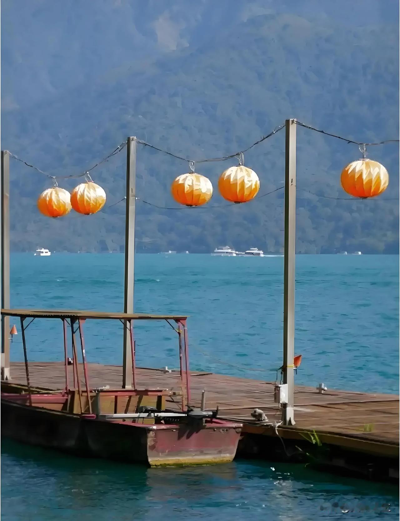 这座台湾最大的淡水湖中央有一座拉鲁岛(原光华岛)将湖泊分为东西两部分,东半部不规则的菱形湖面如日轮,叫日潭,西半部细长弧状似上弦之月,叫月潭。所以那次登玉山回到南投休整一晚后就直奔日月潭,一心在水一方,圆童年的一个美好憧憬。 南投县中央地带的日月潭由玉山和阿里山之间的断裂盆地积水而成,群山环抱的湖面海拔 748 米,水深平均40米,面积约 7.93 平方公里。清朝时即被选为台湾八景之一,有“海外别一洞天”之称 。