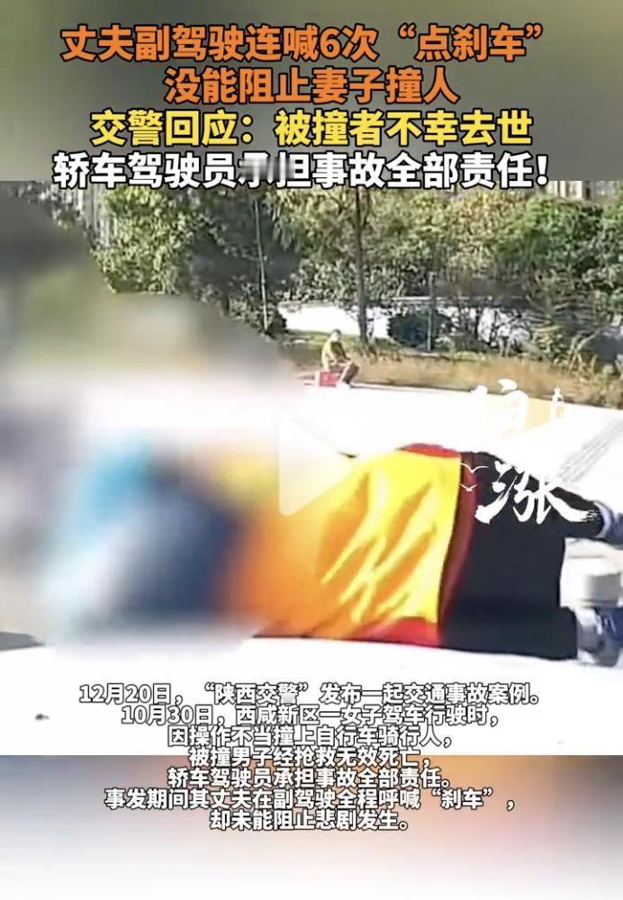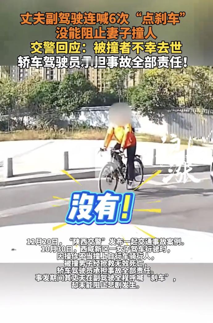 “太不应该了!” 12月20日,陕西交警发布了一起交通事故的视频,视频中一名女子驾车在道路上行驶,在红绿灯处,女子应该是准备转弯,但可能是因为操作不熟练,车辆行进的方向出现了问题。 坐在副驾驶的丈夫见情况不对,赶紧对女子说:“点刹车,点刹车!”此时,前方恰好又出现一位骑着单车的路人,然而女子仍然没有踩刹车,丈夫着急的连声大喊:“点刹车、点刹车!” 这时女子却不耐烦喊了一句:“没有!”而此时车辆已经距离骑行人很近了,看见快要撞到人了,女子吓得“啊,啊”的连声惊叫,随后车辆撞到了骑行人,然而女子仍然没有踩刹车,直到车辆撞到路边的石柱后才停下来,最终被撞的骑行人不幸身亡。 这起事故真的是太不应该了,从视频中看当时的车速并不快,估计时速也就是20公里左右,女子只要稍微点一下刹车就可以把车辆停住,然而丈夫连喊了6次“点刹车”,女子却仍然没有踩半点刹车,最终导致了悲剧的发生。 女子丈夫的处理方式也不好,只是一直在提醒女子踩刹车,其实这时副驾驶只要拉一下手刹就可以把车辆停住,就可以避免悲剧的发生。 一条生命,两个家庭,就这样被毁了!马路不是新手练车的地方,想练车你就去找个没有人的地方去练,练好了熟练了再上路,这是对别人负责,也是对自己负责,否则就是害人害己!