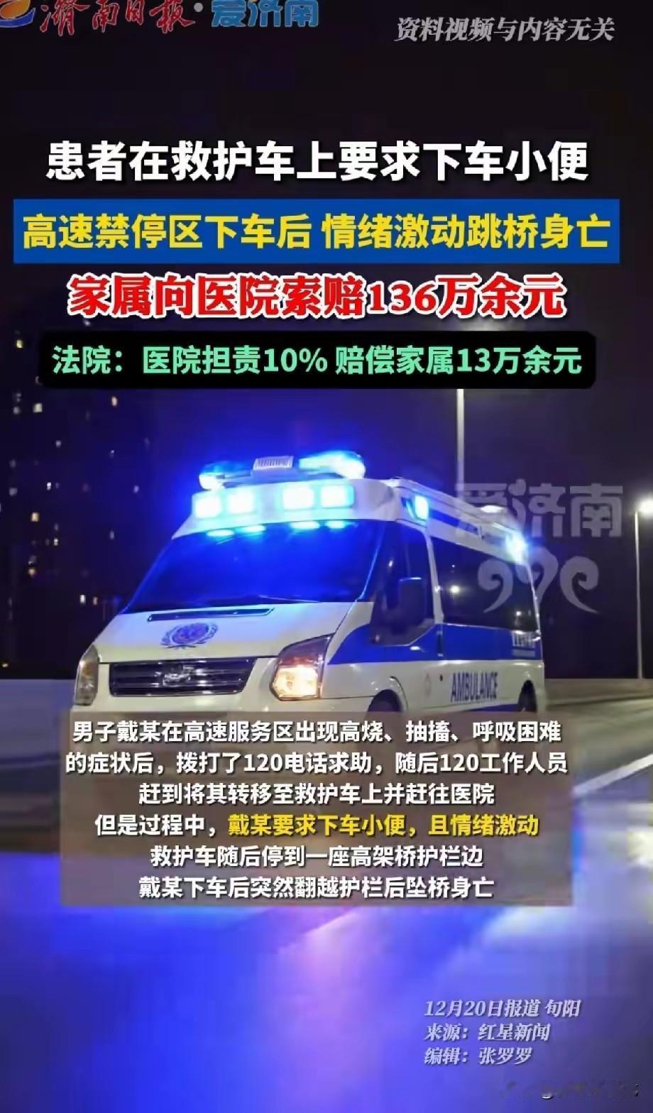 男子戴某在高速服务区突发高烧、抽搐、呼吸困难,拨打120后被送往医院。转运途中,戴某情绪激动,强烈要求下车小便,救护车遂停靠高架桥护栏边。令人意外的是,戴某下车后并未上厕所,反而突然翻越护栏坠桥,被发现时已身亡。事后家属提出索赔,法院已对此案作出判决。 当时戴某蜷在担架上,脸色白得像纸,嘴里一直喊难受,没一会儿突然坐起来拍车门,非要下车小便,情绪激动。随车医护人员劝了好几遍,说高速上不安全,忍忍到医院再说,可戴某根本不听,一个劲挣扎着要往下冲。 医护人员没办法,只能把车停在高架桥应急车道,还特意留了个护士跟着。谁知道车门刚打开,戴某一个劲的冲下去,护士伸手拉都没拉住。他往直奔桥边走,猛地一翻身就翻了过去。护士当场吓得尖叫,司机赶紧停车报警,等消防和民警赶到桥下找到戴某时,人已经没气了。 高架桥少说十几米高,下面全是硬邦邦的水泥路,摔下去哪还有个好?医护人员停车的时候,指定也盯着周围环境,寻思着盯着点应该没事,谁能料到一个要上厕所的人,会突然干出这种事?这种措手不及的状况,医护人员也反应不过来。 家属赶到医院看到结果,当场就崩溃了,哭着喊着要救护车这边给说法,转头就把急救中心告上法院,张口就要巨额赔偿。他们觉得,要是救护车不停,戴某就不会出事,是医护人员失误害了人。 但这事真不能怪医护人员。当时戴某已经有点失控,高烧抽搐的人本就容易躁动,硬把他摁在车上,指不定会闹出更危险的事。要是在车上乱动乱撞,不仅影响司机开车,搞不好还会加重他自己的病情。 医护人员停车是出于人道主义,全程没半点违规操作,坠桥是他自己的突发行为,跟救护车的处置压根不沾边。 这是就是一场悲剧,谁都不愿意看到。法院判的时候,把监控、医护记录、现场勘查报告都捋得明明白白。 出门在外,身体不舒服千万别硬扛,真要是突发急症,就老老实实听医护人员的安排,别由着自己的性子来。生命就这么一次,请珍惜吧。 各位读者你们怎么看?欢迎在评论区讨论。