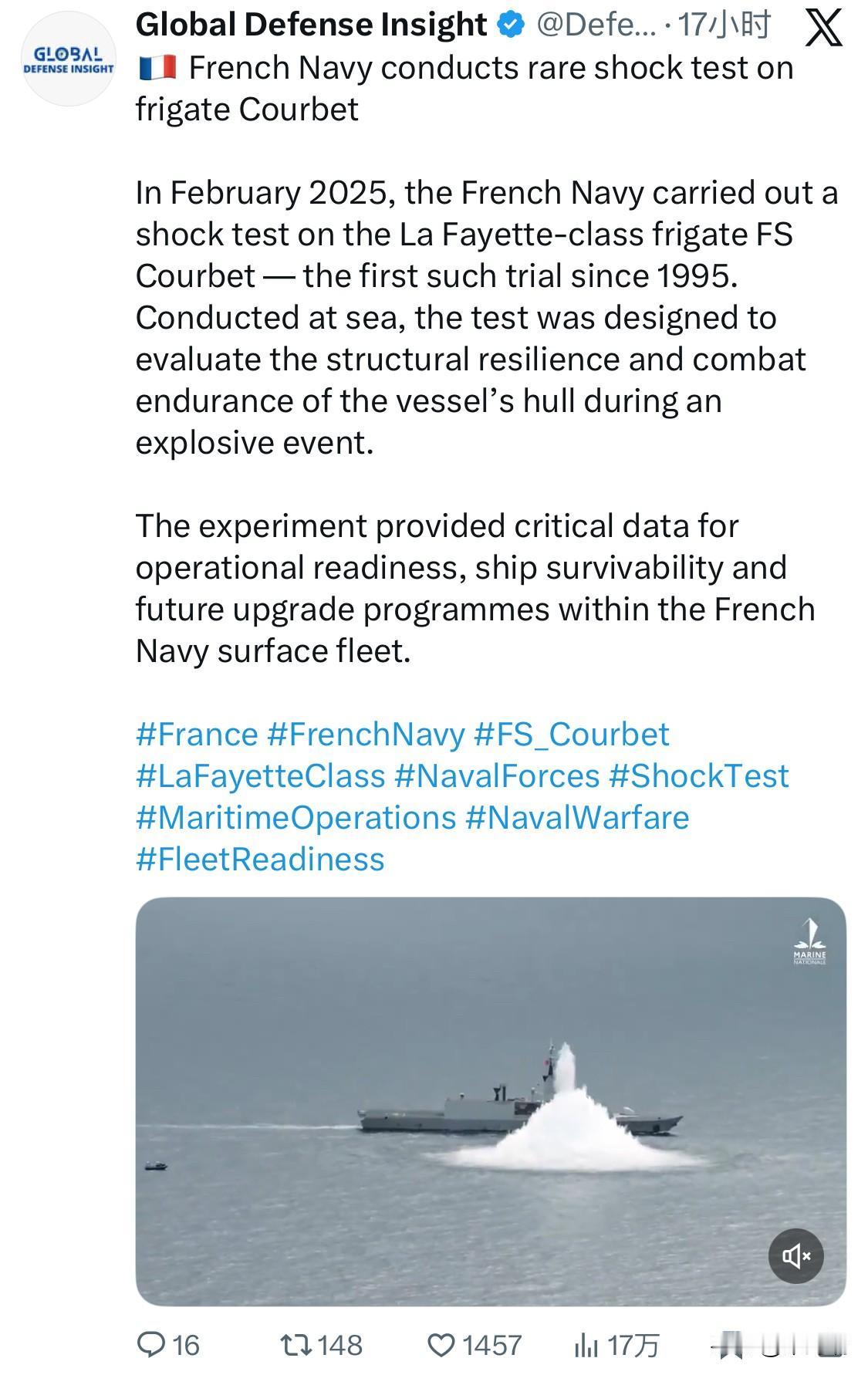 法国海军对库尔贝号护卫舰进行罕见的冲击试验 2025 年 2 月,法国海军对拉斐特级护卫舰 FS Courbet 进行了冲击试验——这是自 1995 年以来的首次此类试验。该试验在海上进行,旨在评估舰艇船体在爆炸事件中的结构韧性和作战耐久性。 该实验为法国海军水面舰队的作战准备、舰艇生存能力和未来升级计划提供了关键数据。