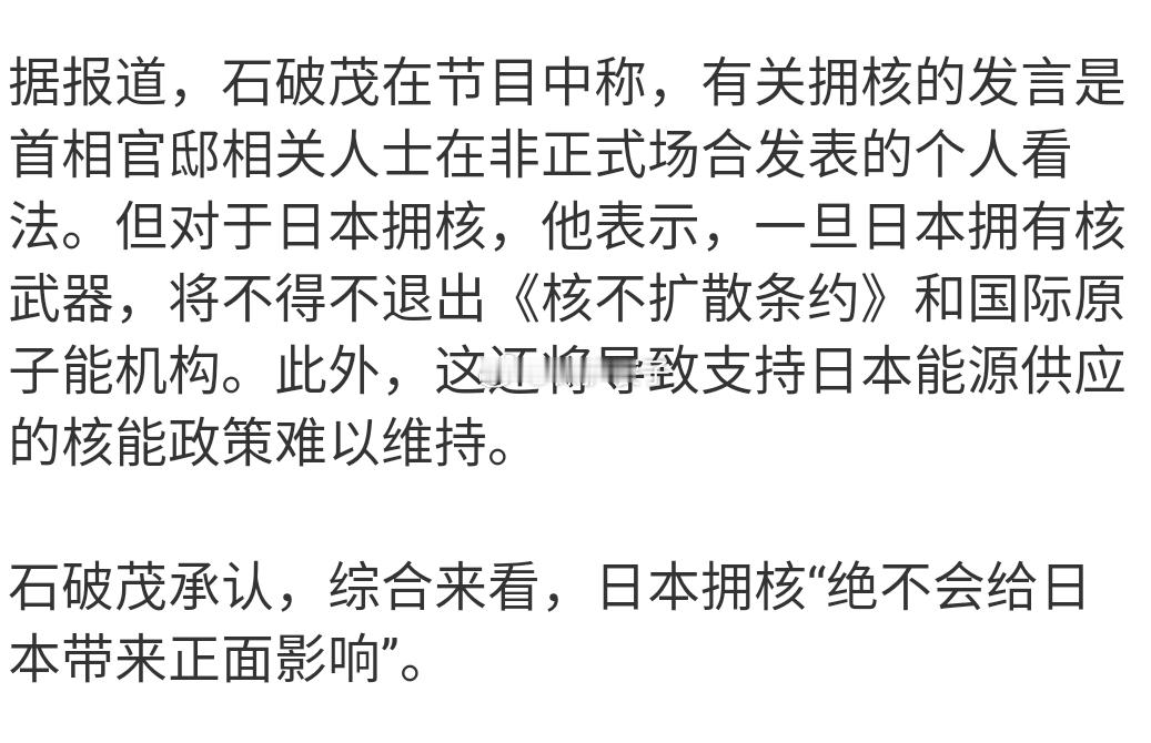 石破茂发声反对日本拥核所以,从那句看出来石破茂是“反对”了????信不信回头有了核就扔下一句从没有明确反对的话来应付,或者干脆说并不是能做决定的人这样的话。面对30万的数字,连句正式的道歉都不肯出的日本,有什么信用可以作为先例?另外,只有走错的路,没有取错的年号,那一年是“招核”,现在是“令核”。不信就等着吧,会有更多激烈的手法继续出来。就算二次后仍然敢自称“天皇”的地方,有什么事不敢的,所有结果都已经在之初已经埋下。袋子时评