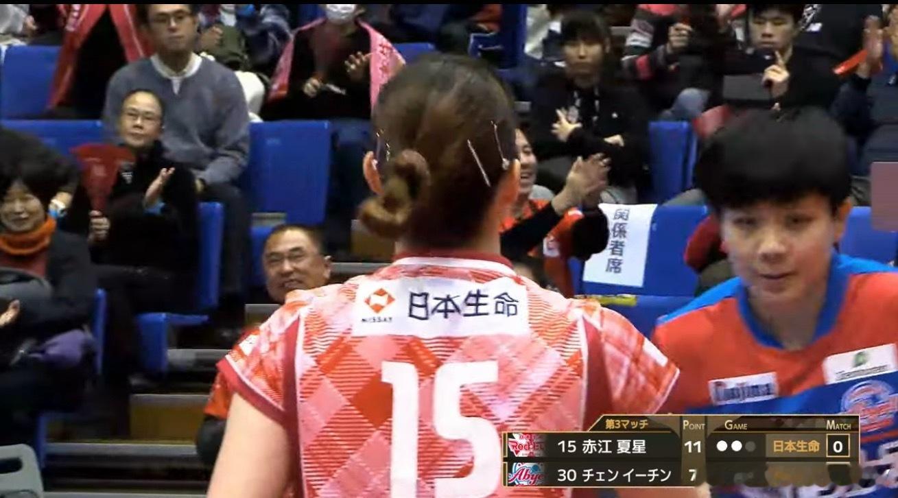 赤江夏星3-1郑怡静(11-9 9-11 11-7 11-7)申裕斌3-2横井咲樱(11-8 7-11 7-11 11-7 11-7)学姐最近太累了 太拼了这边打T联赛 1月wtt三站全上(以前申裕斌再T联赛一胜难求 现在胜率也慢慢上来了)