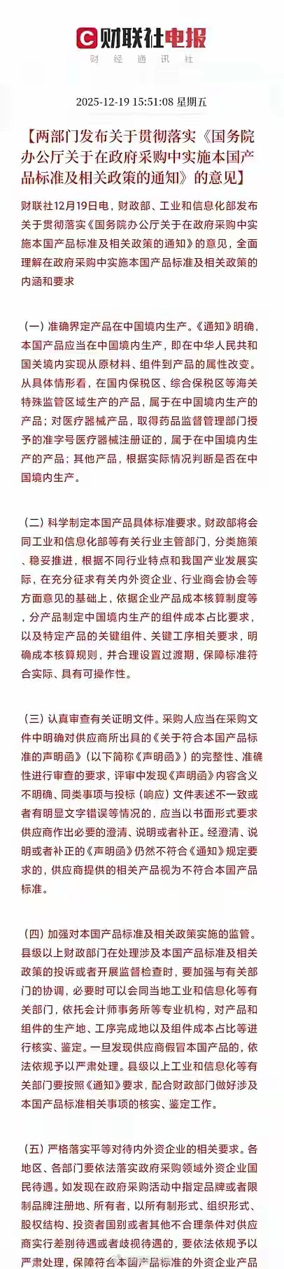 重磅:政府采购推行国产替代(附受益股)一、政策核心要义2025年12月19日,财政部、工信部联合发文(2026年1月1日施行),明确政府采购优先选用境内生产本国产品,推动高端制造国产化。核心规则:境内实质性改变(保税区生产算国产),医疗器械凭国内注册证认定;分行业定组件成本占比,设过渡期;专业机构核查,假冒必究,内外资公平竞争。政策覆盖3.38万亿元采购市场,确定性强。二、四大受益赛道及核心标的1. 医疗器械与科学仪器:迈瑞医疗、联影医疗、华大智造、聚光科技;2. 核心信息技术(信创):中国软件、海光信息、中科曙光、金山办公;3. 工业母机与高端装备:科德数控、海天精工、秦川机床;4. 新材料与关键零部件:鼎通精密、中材科技、新坐标。三、落地节奏(按兑现优先级)1. 医疗器械与科学仪器(2026Q1起):政策施行即释需求;2. 信创(2026Q1-Q3):6月前定分行业标准,采购放量;3. 工业母机与高端装备(2026Q2起):9月前出细化标准;4. 新材料与关键零部件(2026Q3起):随整机国产化受益。四、业绩弹性预测1. 医疗器械与科学仪器(高弹性):2026年营收增速25%-30%,龙头净利润增速超30%;2. 信创(中高弹性):营收增速20%-25%,龙头净利润增速25%-35%;3. 工业母机与高端装备(中弹性):营收增速15%-20%,龙头净利润增速20%-25%;4. 新材料与关键零部件(中低弹性):营收增速12%-18%,细分龙头净利润增速18%-22%。五、关键提醒聚焦采购名录内技术达标龙头;跟踪2026Q2(分行业标准落地)、Q4(首批订单交付)节点;动态关注政策调整,规避不达标企业风险。