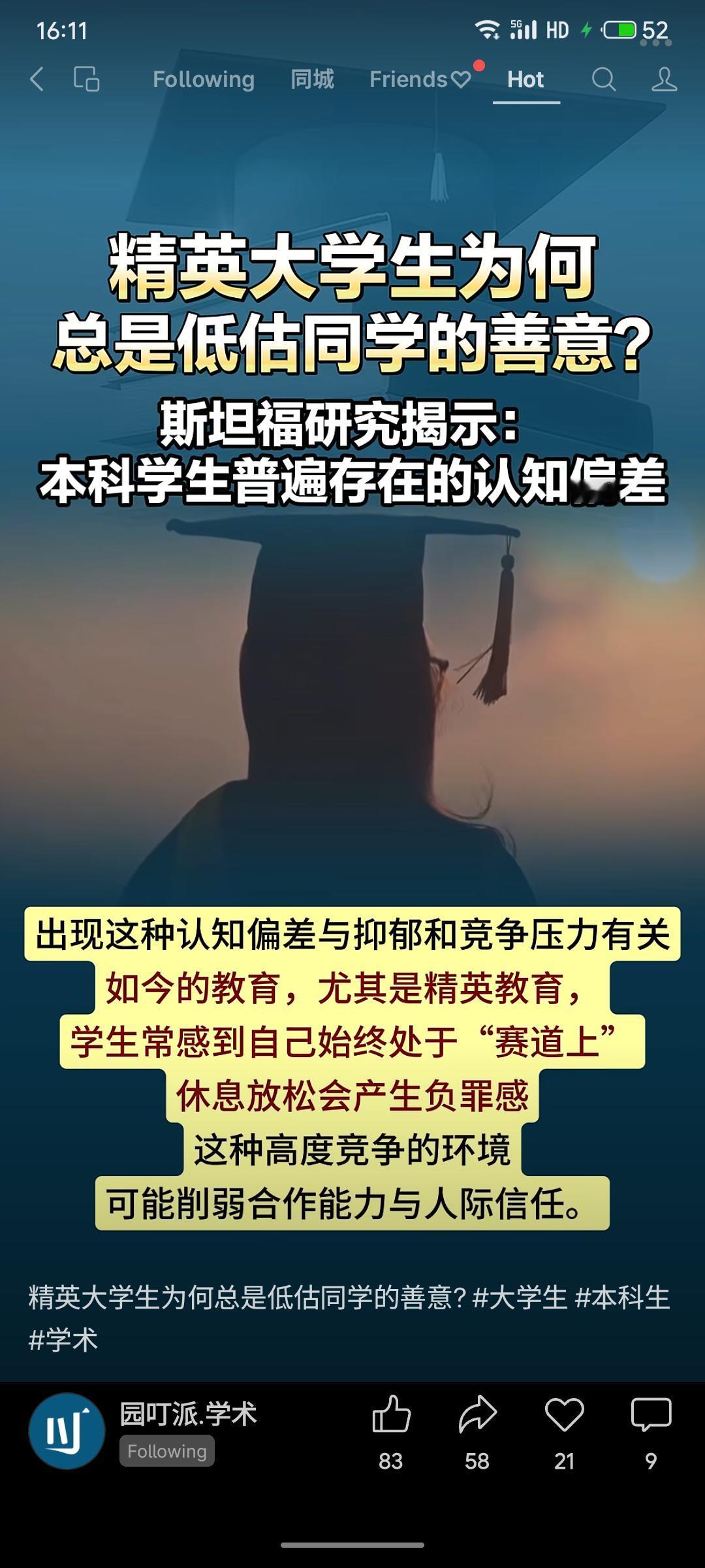研究发现精英大学生普遍低估同学的善意,这种认知偏差与抑郁情绪及高度竞争环境有关。长期处于“赛道”压力下,可能削弱人际信任与合作意愿。