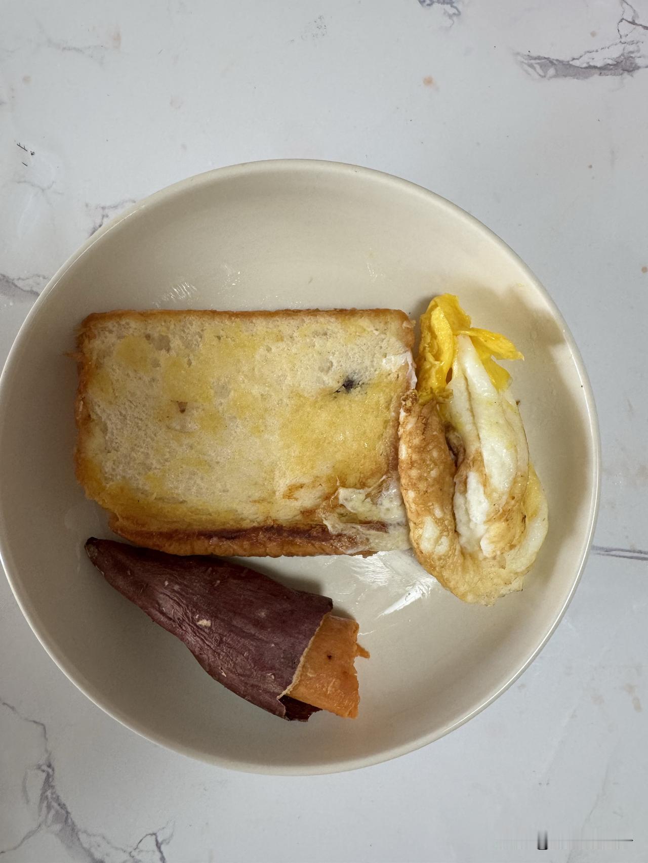 也不费劲一个面包煎一下顺便把鸡蛋煎下 地瓜是昨天蒸好的叫西瓜红地瓜挺好吃 一顿早饭轻松解决了