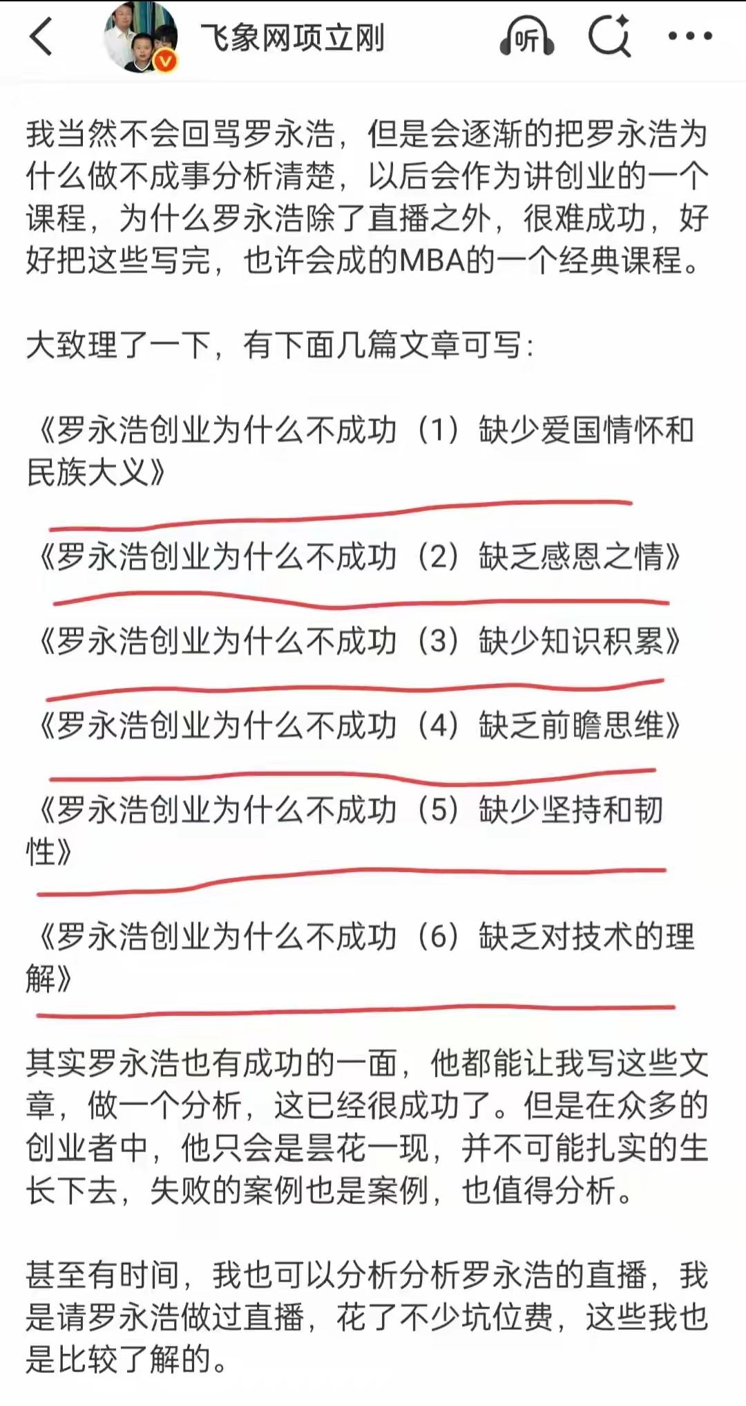 罗永浩这一次是碰到硬茬子了,过去那些被罗永浩怼的企业家之所以吵不过罗永浩,主要是企业家们是要面子的,不想和罗永浩在网络上打口水仗,但这次罗永浩对上的项立刚可不是什么企业家,人家也是常年混迹于网络上的网络大V,更重要的是他过去和很多人都打过口水仗。 项立刚一上来就直接戳老罗的“肺管子”,罗永浩最不愿意被别人提到的话题就是他科技创业失败的事情,网络上都嘲讽老罗是“行业冥灯”,也就是老罗涉足哪个行业哪个行业就走下坡路,像老罗宣布做VA,结果现在这个行业没一点声音了。 我觉得项立刚真的不愧是网络吵架高手,他对罗永浩的策略就是反复论述“罗永浩为什么创业不成功”,这无疑是让罗永浩有苦说不出。华与华老板华杉真的要感谢项立刚,现在华杉都不用自己出来吵架了,华与华老板华杉过去服务的客户成绩与罗永浩形成了鲜明的对比,因为跟华与华合作的企业都成功了,其中更是有千亿市值的企业,例如蜜雪冰城。